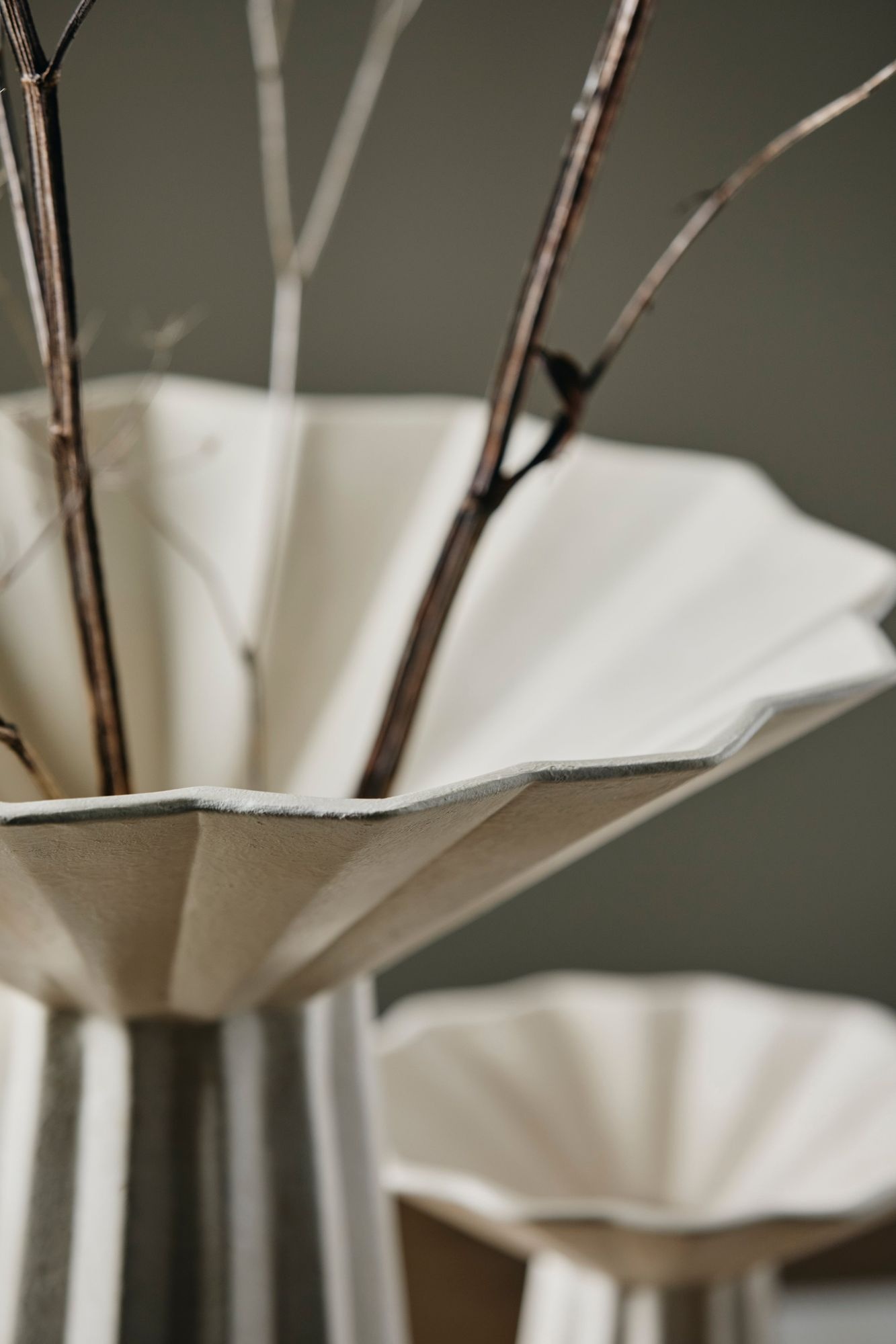 The MINU Vase is made with a beautiful Textured Surface.#The vase's ribbed pattern opens up at the top, spreading out like a fan. An elegant and sculptural vase that gives your bouquet a stunning look. The voluminous size of the MINU vase makes it a statement piece in itself, enhancing the decor with a beautiful bouquet of flowers, or it can stand alone as a sculptural statement.##It is recommended to change the water frequently and wash the vase thoroughly after use.#Wipe with a dry cloth to avoid water spots or streaks.