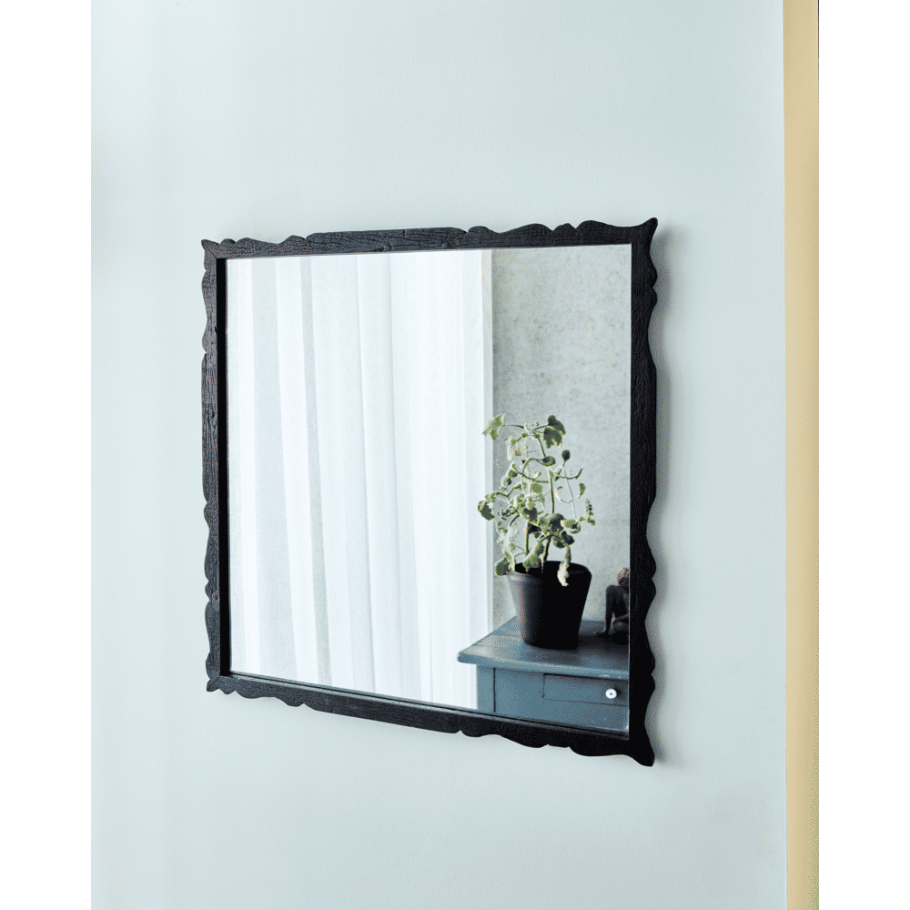 Bring a sense of charm and personality to your home with this square mirror featuring a beautifully carved, wavy wooden frame in a warm brown shade. The recycled wood and handmade finish ensure each piece stands out as unique, infusing your hallway, bedroom, or living area with authentic character. Hang it as a functional accent or let it serve as a distinct wall decoration that sparks conversation.- Recycled wood frame- Handcrafted uniqueness- Artistic wavy carving- Warm brown finishRefresh your décor with statement-making style and timeless warmth. Material:Front material: Glass (100%) Back material: MDF (100%) Frame: Wood (Recycled) (100%) Small parts: Iron (100%) Inhoud: Foodsafe: Martindale: Montage vereist: Nee Onderhoud / reiniging: Clean with a moist cloth