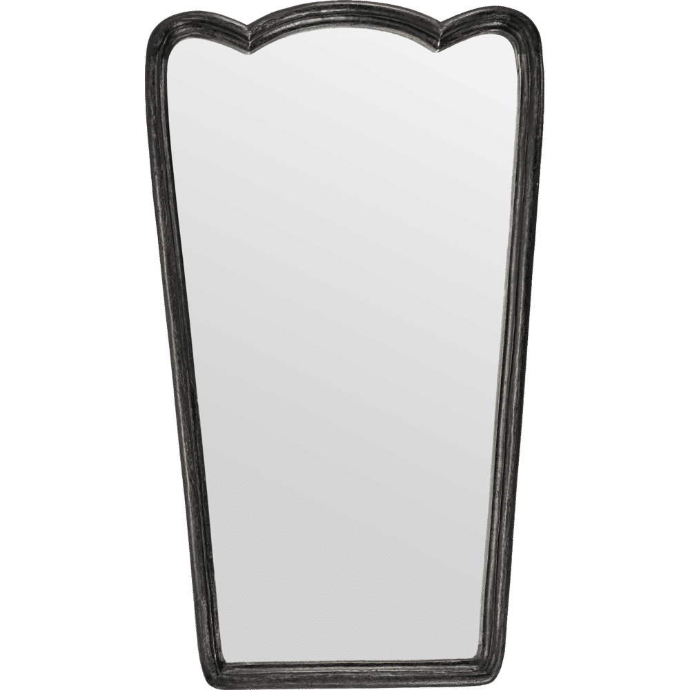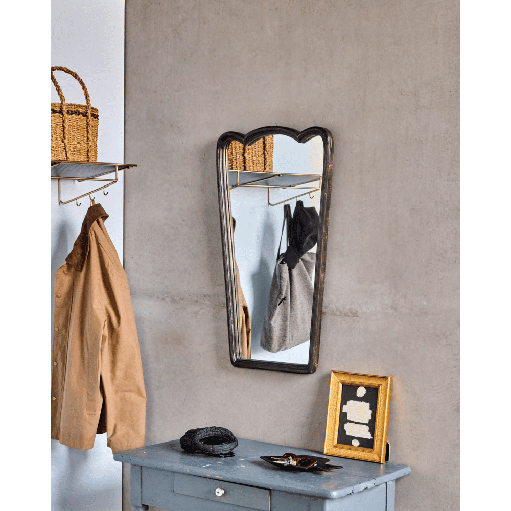 This mirror with a stained black mango wood frame brings a bold, artistic touch to your home. Three graceful arches at the top create a striking focal point, exuding character wherever you hang it. Handmade details ensure every mirror stands out with its own unique charm, making it more than just a practical element - it's a statement piece for your hallway, bedroom or living area.- Handmade, unique design.- Stained black mango wood.- Distinctive triple-arched frame.- Adds style and personality.Update your hallway or bedroom with eye-catching sophistication and lasting style. Material:Front material: Glass (100%) Back material: MDF (100%) Frame: Mango Wood (100%) Inhoud: Foodsafe: Martindale: Montage vereist: Nee Onderhoud / reiniging: Clean with a dry cloth