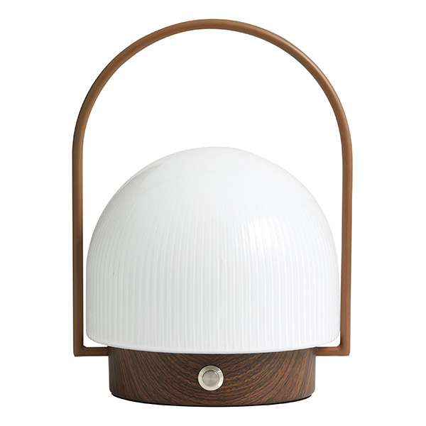MOMUS is a portable lamp in brown iron with a fluted glass screen. The striking contrastbetween the rounded, fluted glass and the solid metal base creates a balanced yet intriguing silhouette. The lamp has a handle that makes it easy to carry around with you, bringing light into every room. MOMUS has an LED construction and a life span of 25,000 hours of light. At maximum charge, the lamp delivers light for 10 hours straight. Material: Iron, glass