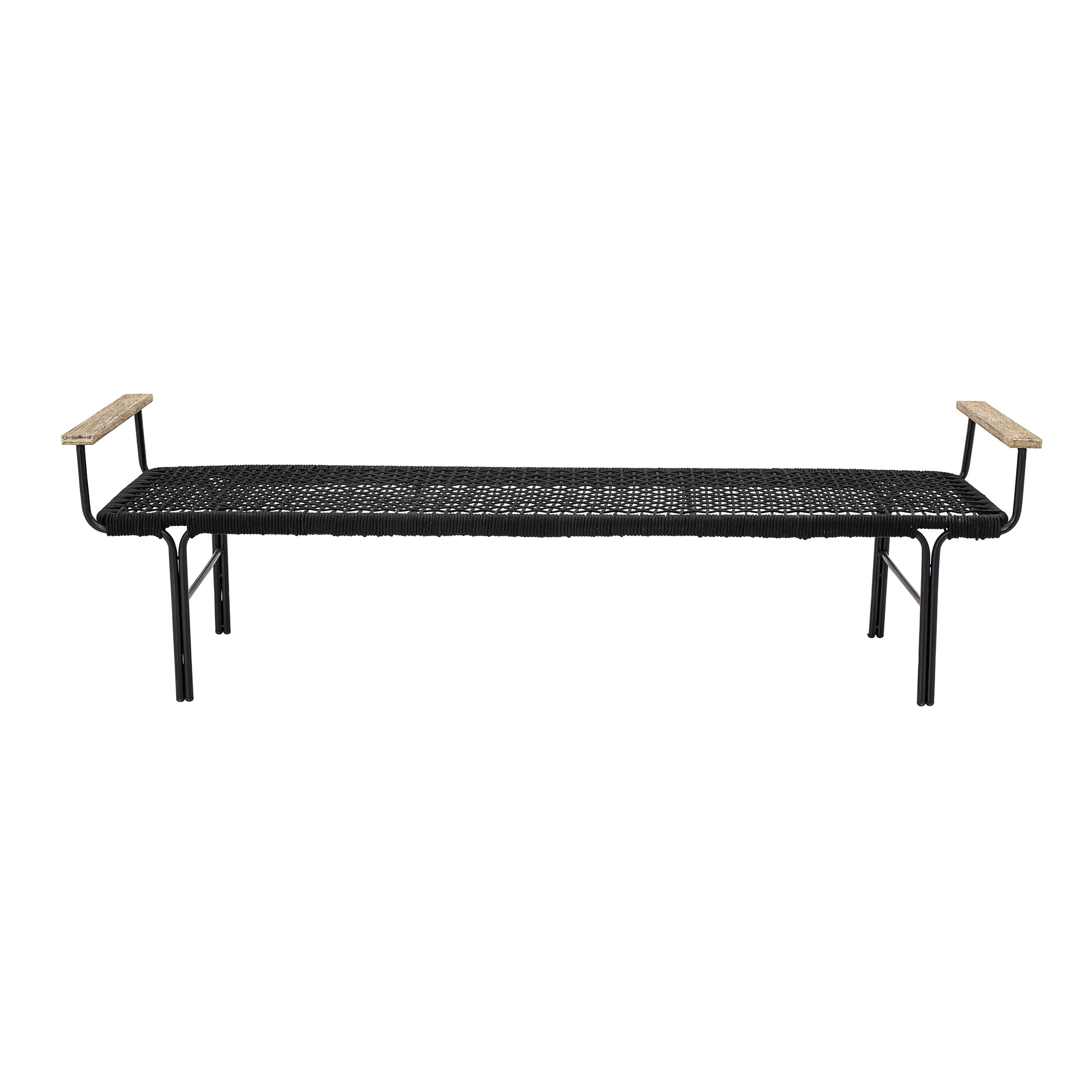 The Mundo bench fits both outdoors (under a roof), and indoors. The frame is made in powder coated metal and of polyester rope in black color that has been hand-woven on the seat, the handles at the sides are made of Acacia wood. Seat height cm: 40. Seat depth cm: 50. Seat lenght cm: 160. Max weight kg: 320. Delivered assembled. Care instructions: Wipe clean with a moist cloth. This item belongs to the Mundo series of outdoor furniture, where you can also find a sofa, lounge chairs, coffee table, among other beautiful outdoor elements. Care instruction: Wipe clean with a moist cloth. Material: Metal, Polyester, Acacia wood