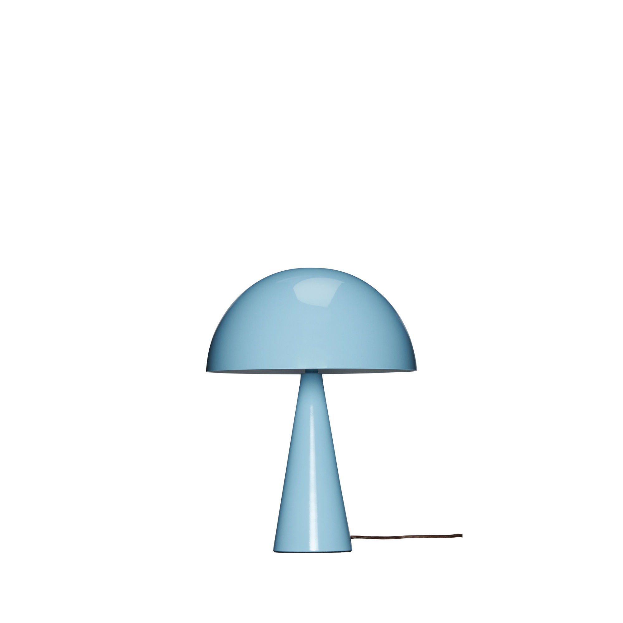 Small table lamp in a glossy light blue with a brown fabric cord with an inline switch.