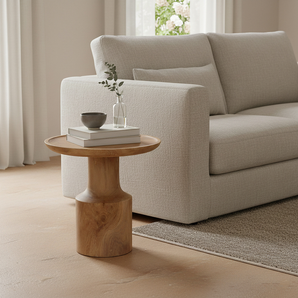 The wood is finished with a water-based coating that protects against moisture and stains. However, it's wise to wipe up spilled drinks or liquids immediately to prevent rings. Clean the table with a soft, slightly damp cloth – avoid harsh cleaning agents. Minor scratches or imperfections can easily be touched up with a transparent or light-colored furniture oil.