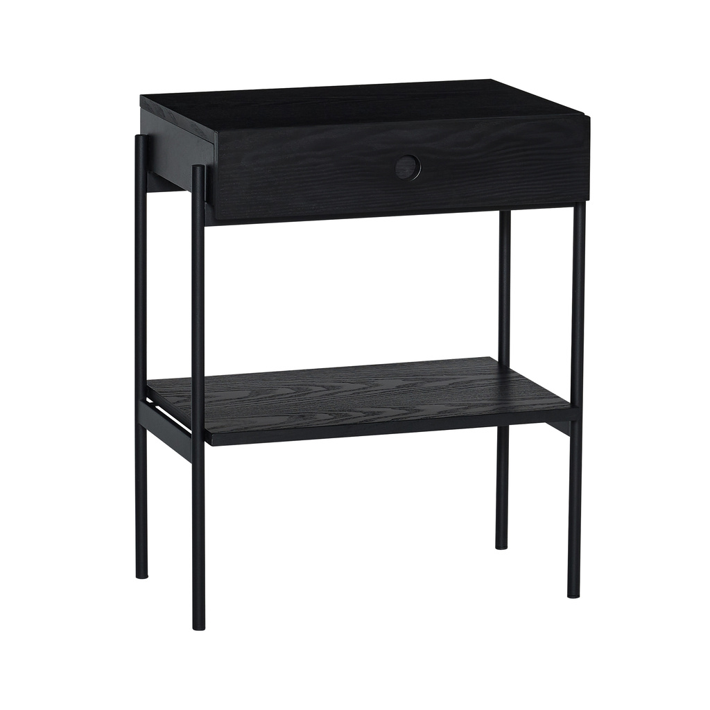 Introducing the Noir Bedside Table, a perfect blend of functionality and style, dressed in an elegant black. Crafted from ash veneer with metal accents, this piece adds a bold and sleek look to your bedroom decor. Featuring a handy drawer, it's ideal for stowing away your bedroom essentials, keeping your space tidy. The surface is just right to store your evening read, ensuring practical storage near the bed. Transform your nightly routine with the stylish convenience of the Noir Bedside Table.