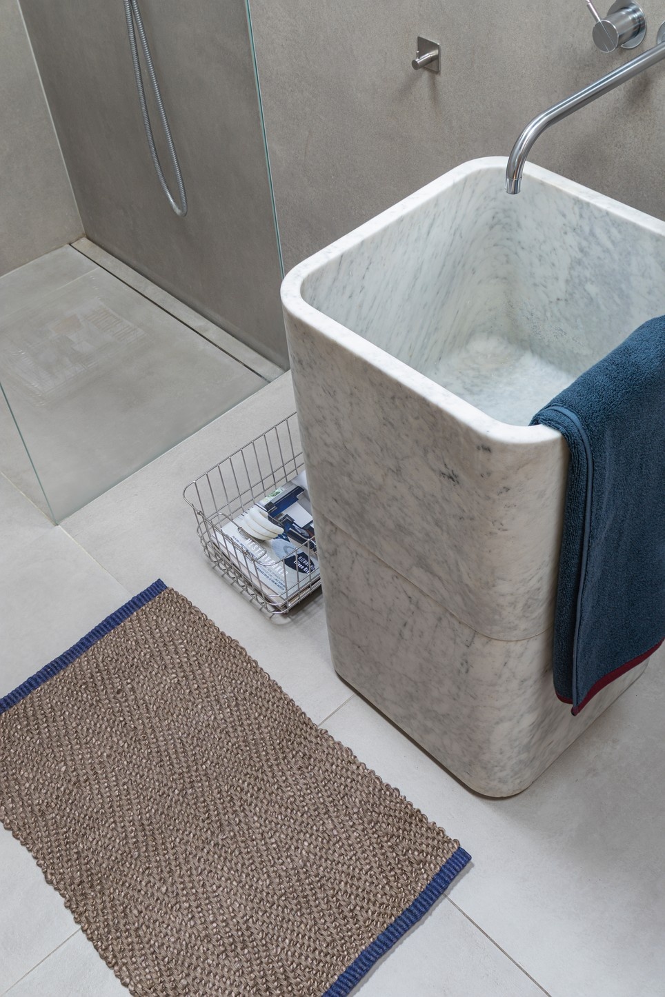 NOTES jute rug from Mette Ditmer is a tactile and durable piece that balances function and aesthetics. Hand-woven in 100% natural jute, it features a distinctive weave that adds depth and texture to the surface. The warm Latte tone is accented by a cobalt blue border for a fresh, yet subtle contrast. Thanks to its solid feel, the rug stays firmly in place – ideal by the front door, back entrance or in the hallway. Tip: We recommend using a non-slip underlay to protect the floor and keep the rug securely in place. - Material: 100% jute - Washing/Care Instructions: Vacuum the runner regularly. Washing is not recommend