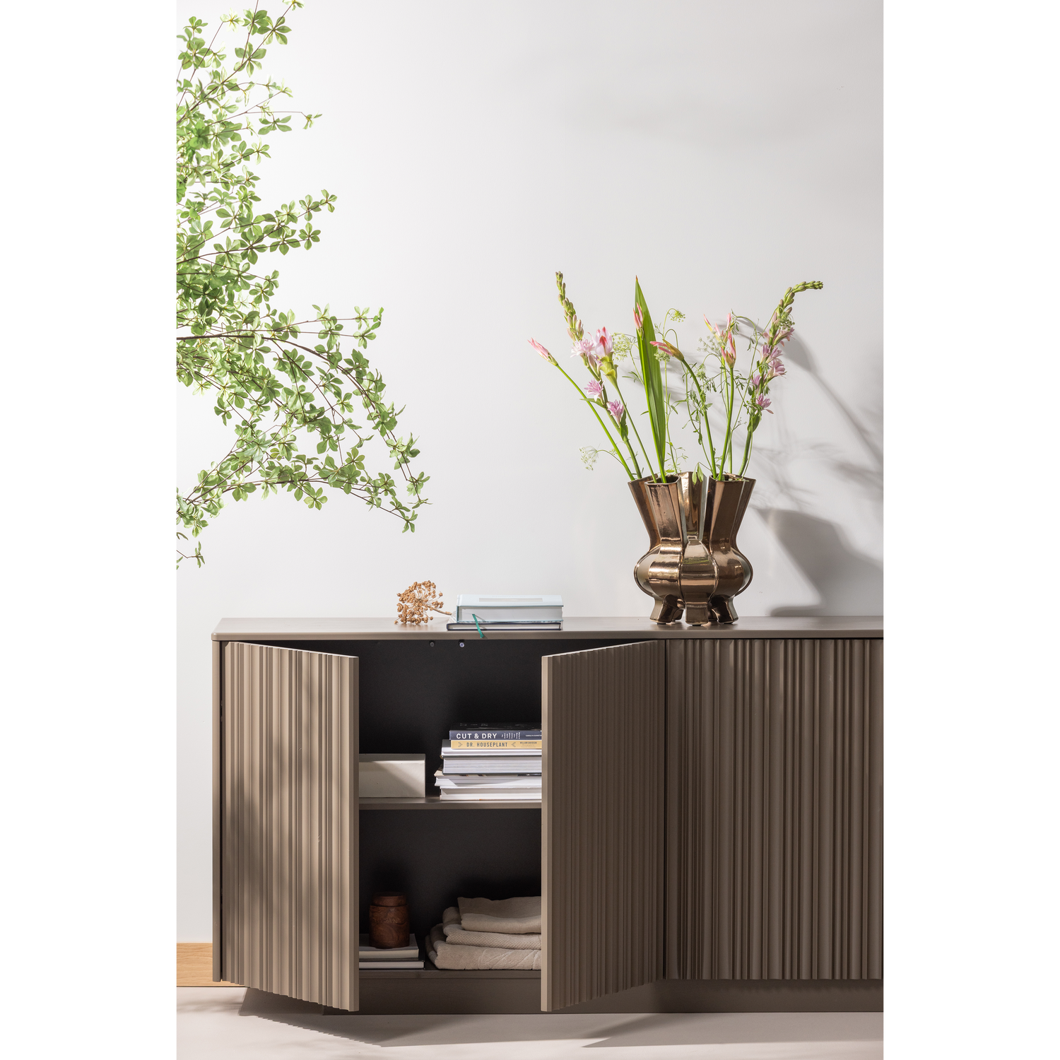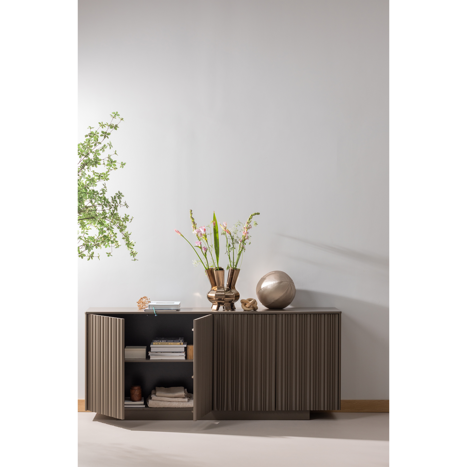 - Royaal dressoir met grafische relief deuren - Gemaakt van grenenhout (FSC mix gecertificeerd) - Veel opbergmogelijkheid - H 85 cm x B 200 cm x D 40 cm Het Nova dressoir van het Nederlandse interieurmerk WOOOD heeft een grafisch design en een luxe uitstraling. Het dressoir is volledig vervaardigd uit grenenhout (FSC mix gecertificeerd) en komt uit onze eigen fabriek in Nederland. Achter de vier deuren vind je royale opbergruimte om al jouw spullen netjes en stijlvol uit het zicht te bewaren. Dankzij het moderne ontwerp past Nova moeiteloos in iedere interieurstijl en voegt het warmte en elegantie toe aan jouw woning. Materiaal De grenenhouten meubelen uit onze collecties zijn FSC mix gecertificeerd en worden op diverse manieren behandeld. Het Nova dressoir is gemaakt van geschuurd grenen en is glad en netjes afgewerkt. Grenenhout is een natuurlijk materiaal wat wij graag extra benadrukken, de karaktervolle nerftekeningen zijn bij ieder artikel anders. Hierdoor is elk meubel uniek. Afmetingen - Hoogte: 85 cm - Breedte: 200 cm - Diepte: 40 cm - Dikte van de deurtjes: 2,4 cm - Gewicht: 44 kg - Draaggewicht legplanken: 15 kg - Totaal draaggewicht: 40 kg Onderhoud Onbehandeld grenenhout heeft een relatief korte levensduur, gemiddeld 5-10 jaar. Om deze reden behandelen wij onze grenenhouten meubelen om de levensduur aanzienlijk te verlengen. Behandeld grenenhout is eenvoudig schoon te houden met een lichtvochtige doek. Om kringen en plekken in het hout te vermijden is het aangeraden om vochtige vlekken direct te drogen. Stabiel en veilig gebruik Voor kasten hoger dan 50 cm raden we aan om extra aandacht te besteden aan de muurbevestiging. De montage van de valpreventie voorkomt ongelukken en behoudt de kast voor kantelen. Levering Het grenenhouten dressoir wordt geleverd in twee pakketten en is gemakkelijk te monteren aan de hand van de duidelijke montage-instructie. Plaats voor het beschermen van harde vloeren viltglijders onder de poten. Zorg dat de omvalbeveiliging goed is gemonteerd om ongelukken te voorkomen.