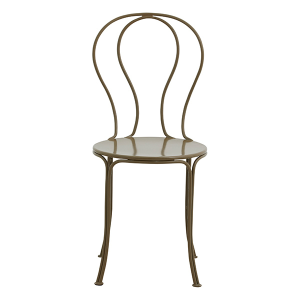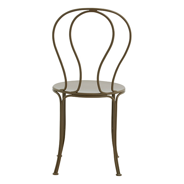 OLIVO garden chair in green-painted iron. A charming garden chair that, with its simple frame, achieves a timeless, classic look. OLIVO features an elegant design where the curves of the back provide comfort and a cozy, inviting ambiance. This garden chair is ideal for outdoor use, but for a more romantic and light expression, OLIVO can also be used indoors as a sophisticated touch to your décor.##Dimensions: Seat depth: 40 cm. Seat height: 46,5 cm.