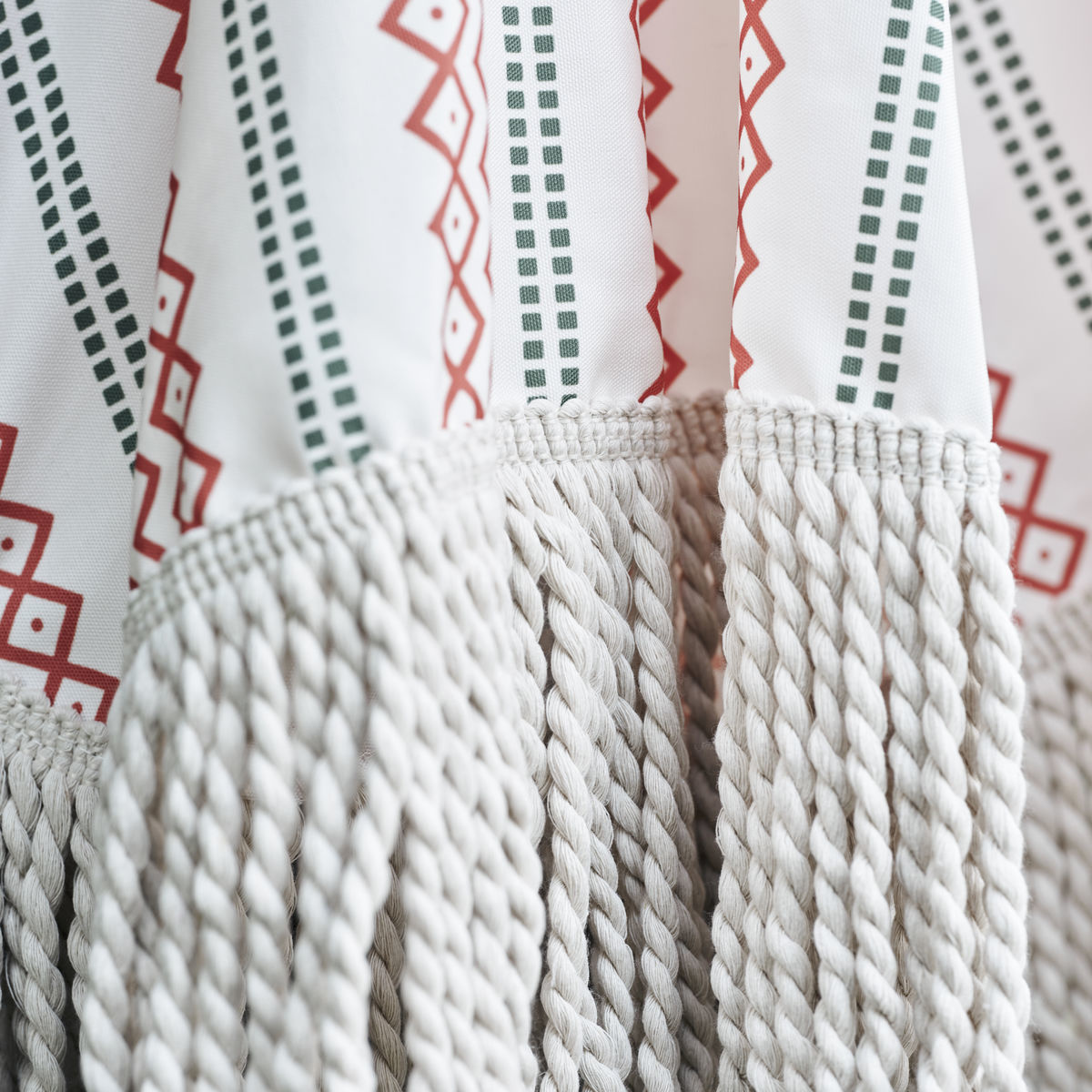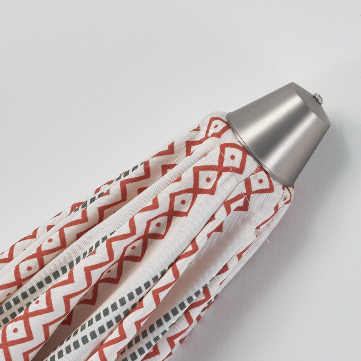Enjoy a warm summer day in the shade thanks to Umbra, a garden umbrella designed by House Doctor. With its green and red colourscheme along with long, thick fringes, the umbrella lends your outdoor area a stylish look with an unmistakable hint of vintage. Whether your terrace is furnished with wooden, concrete or metal furniture, this garden umbrella elevates the overall look and gives the area a refined, yet relaxed expression. The wooden pole can be taken apart, so you can put the garden umbrella in the bag for easy storage. Base not included. The diameter of the pole is 32mm. Material: Polyester, Beech wood Care instructions: Spot clean only