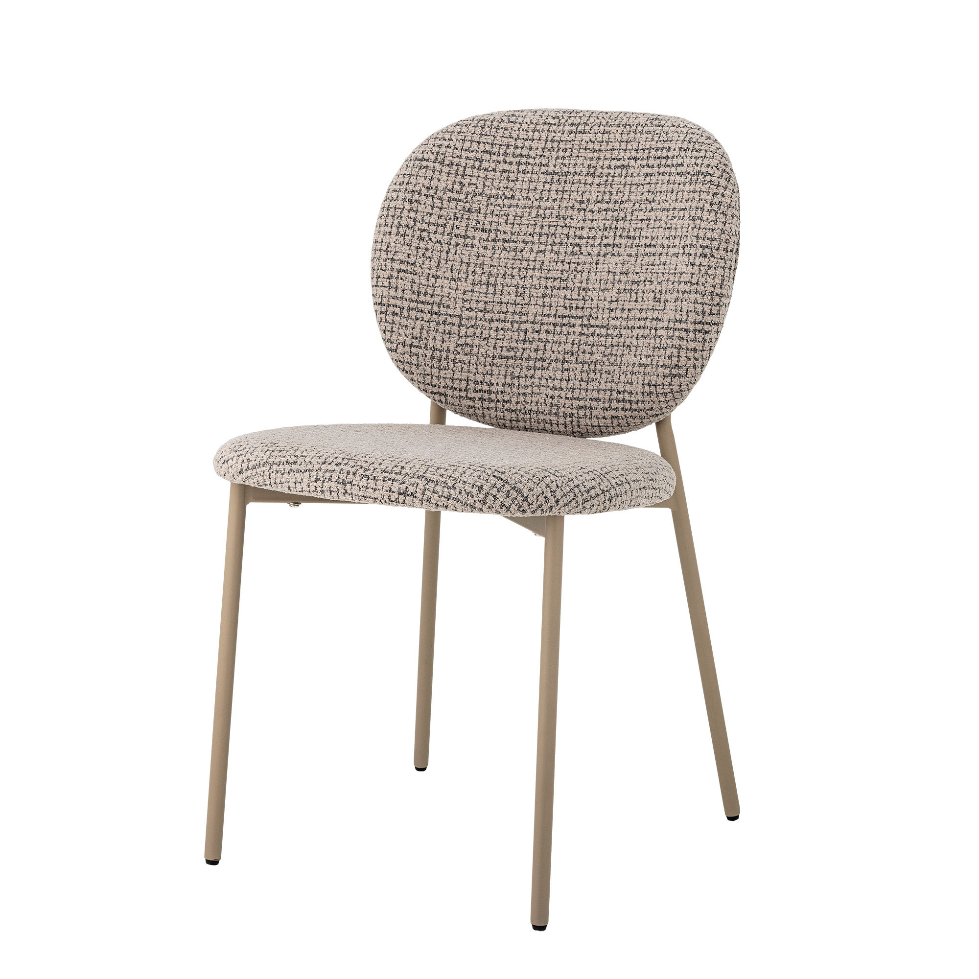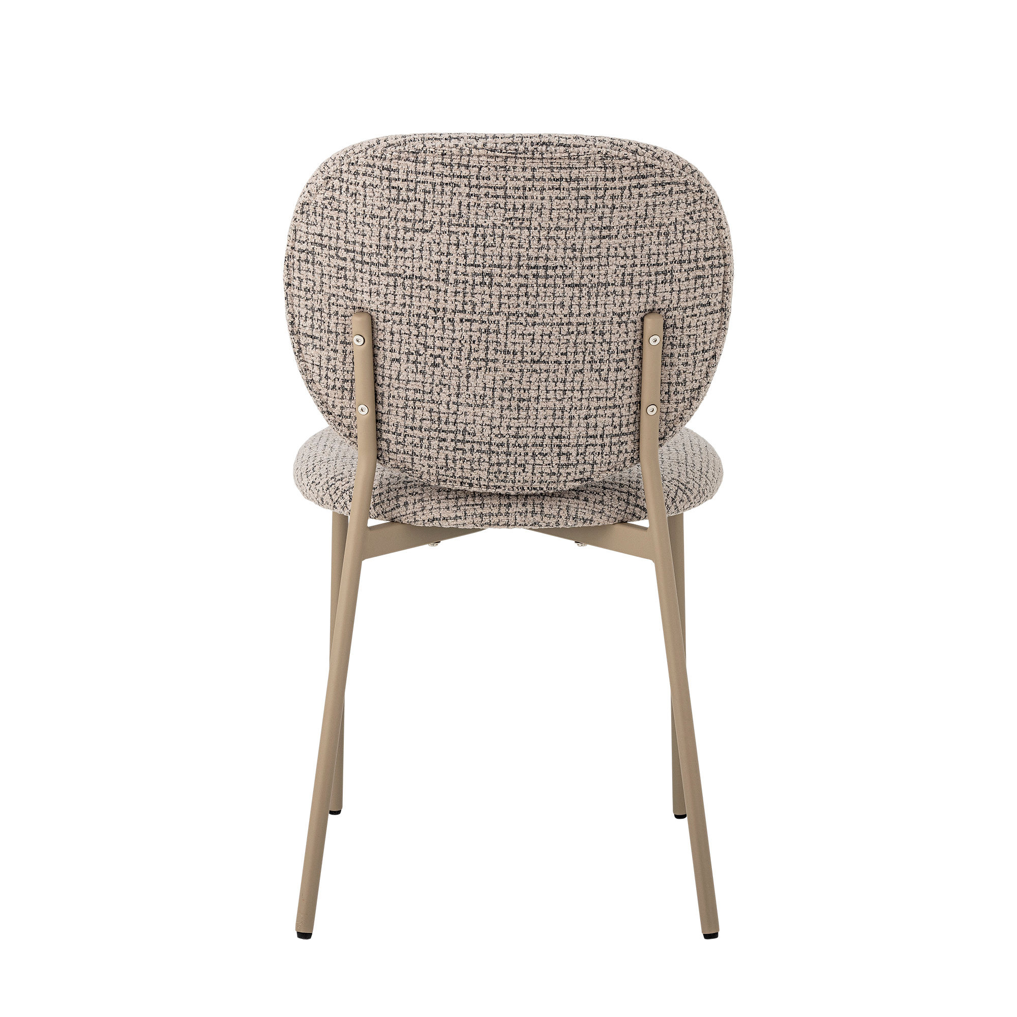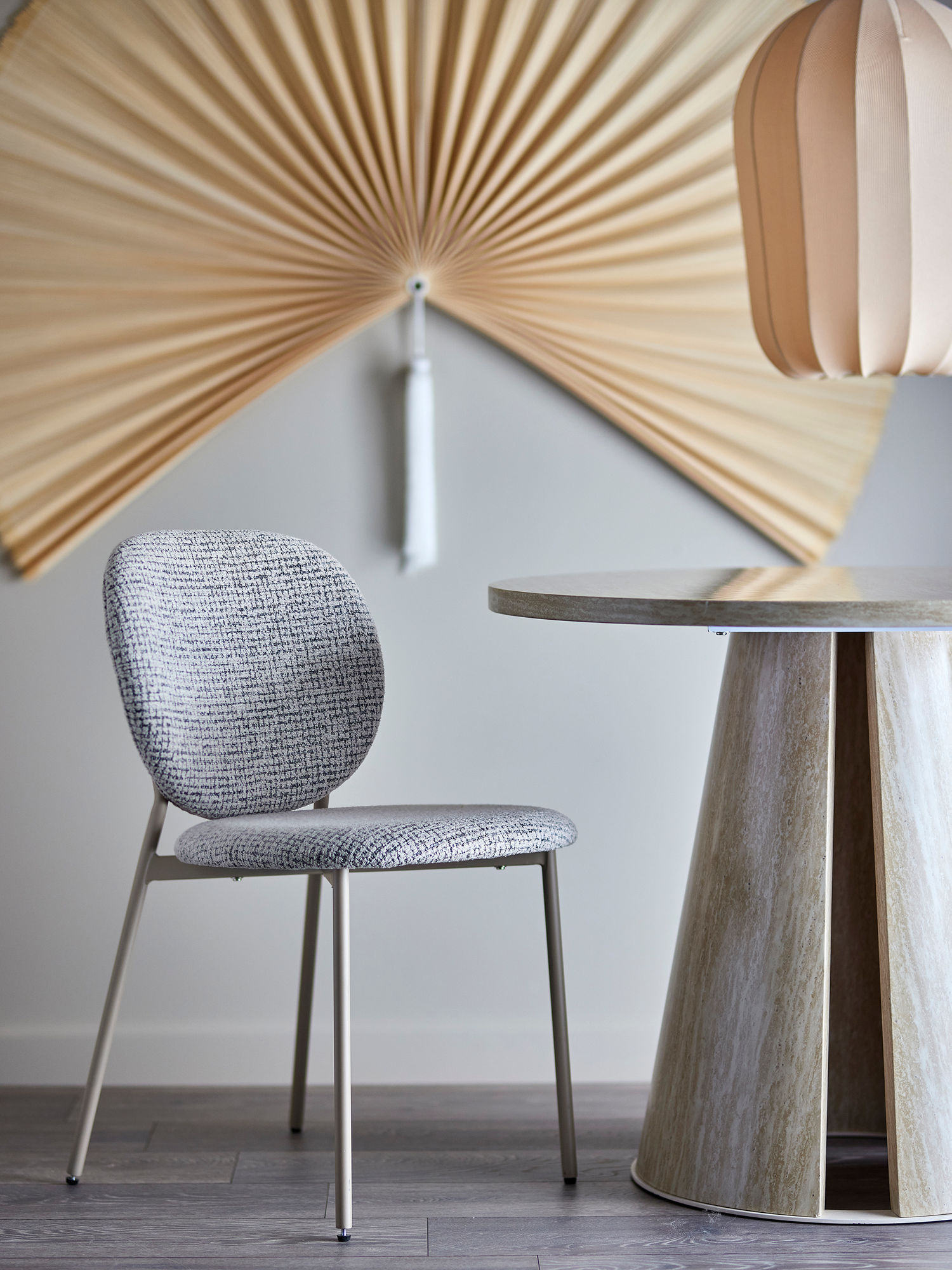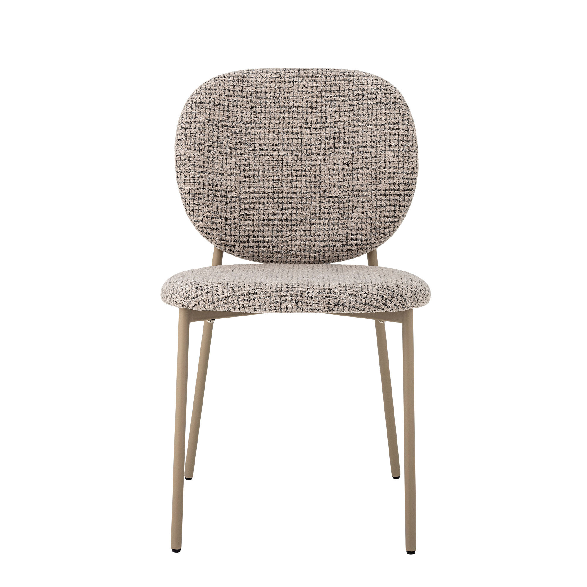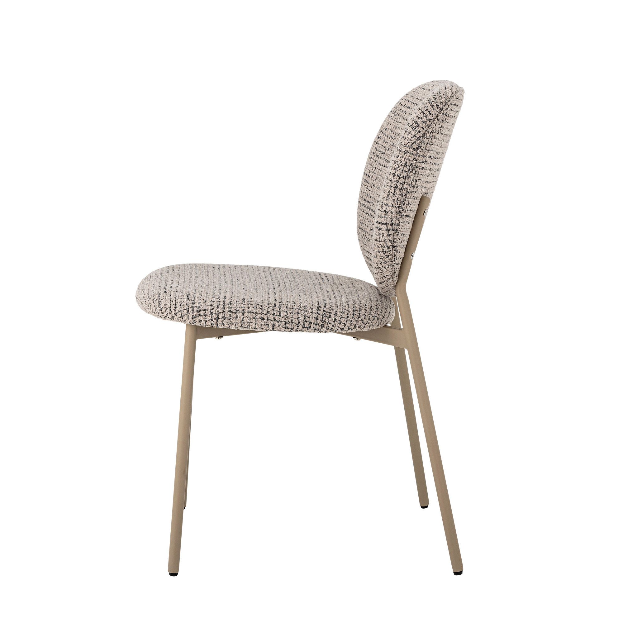The Percey Dining Chair by Bloomingville features a padded seat and backrest in grey melange chenille fabric, offering a soft and textured appearance. The chair is constructed with metal legs and plywood. It is stackable and comes with adjustable feet caps to ensure stability on different surfaces.