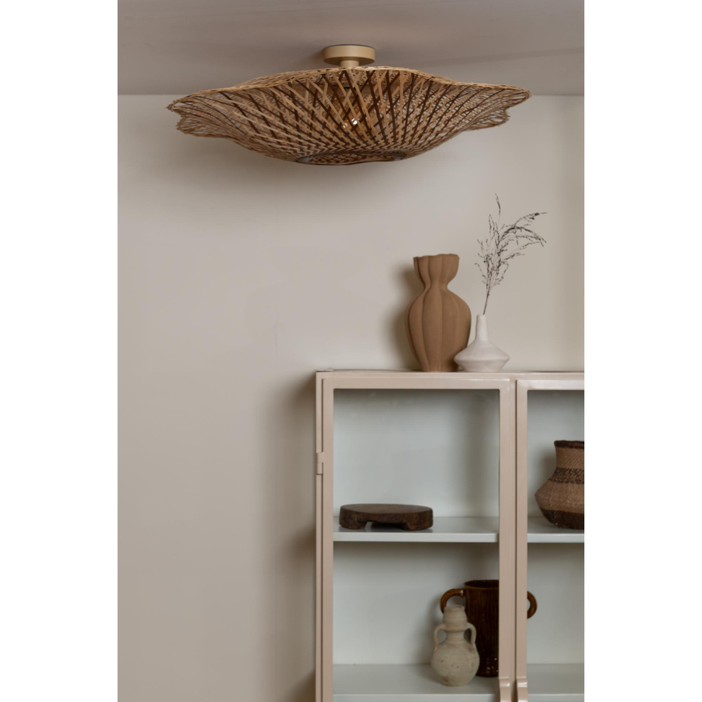 De Madura plafondlamp naturel/bruin is geïnspireerd op de exotische schoonheid en rijke cultuur van het Indonesische eiland Madura. Dit unieke bloemvormige ontwerp en de kleur van natuurlijk bamboe roept de delicate vormen van tropische bloemen en de ambachtelijke tradities van het eiland op. De plafonnière is geweven in 2 natuurlijke tinten bamboe wat zorgt voor een speels effect. Door het geweven materiaal vormt er zich een prachtig spel van licht en schaduw. Het licht straalt een warme, uitnodigende sfeer uit. Voeg organische elegantie toe aan je slaapkamer, woonkamer of eetkamer met deze plafondlamp. De Madura plafondlamp is perfect voor wie houdt van een interieur vol natuurlijke schoonheid en authentieke charme.