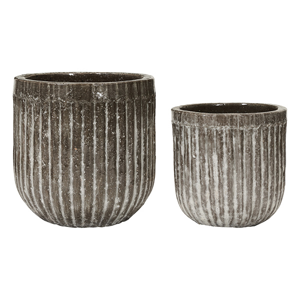 This set of two outdoor planters from House Doctor give your garden an instant update. The handmade earthenware planters come in two sizes and have been given a smooth glaze in varying shades of brown with white detailing and vertical grooves. A timeless, yet contemporary design in a natural colour scheme that make them blend in seamlessly. Use Pharao with your favourite flowers, plants or perhaps even a small tree. The planters can withstand temperatures down to -20C and come with drainage holes at the bottom. Due to the nature of the reactive glaze, the colour and finish of this planter may vary. That is a natural feature and part of the craftsmanship behind the handmade design. Material: Earthenware Care instructions: Clean with a moist cloth, Frostsafe, Suitable for outdoor use