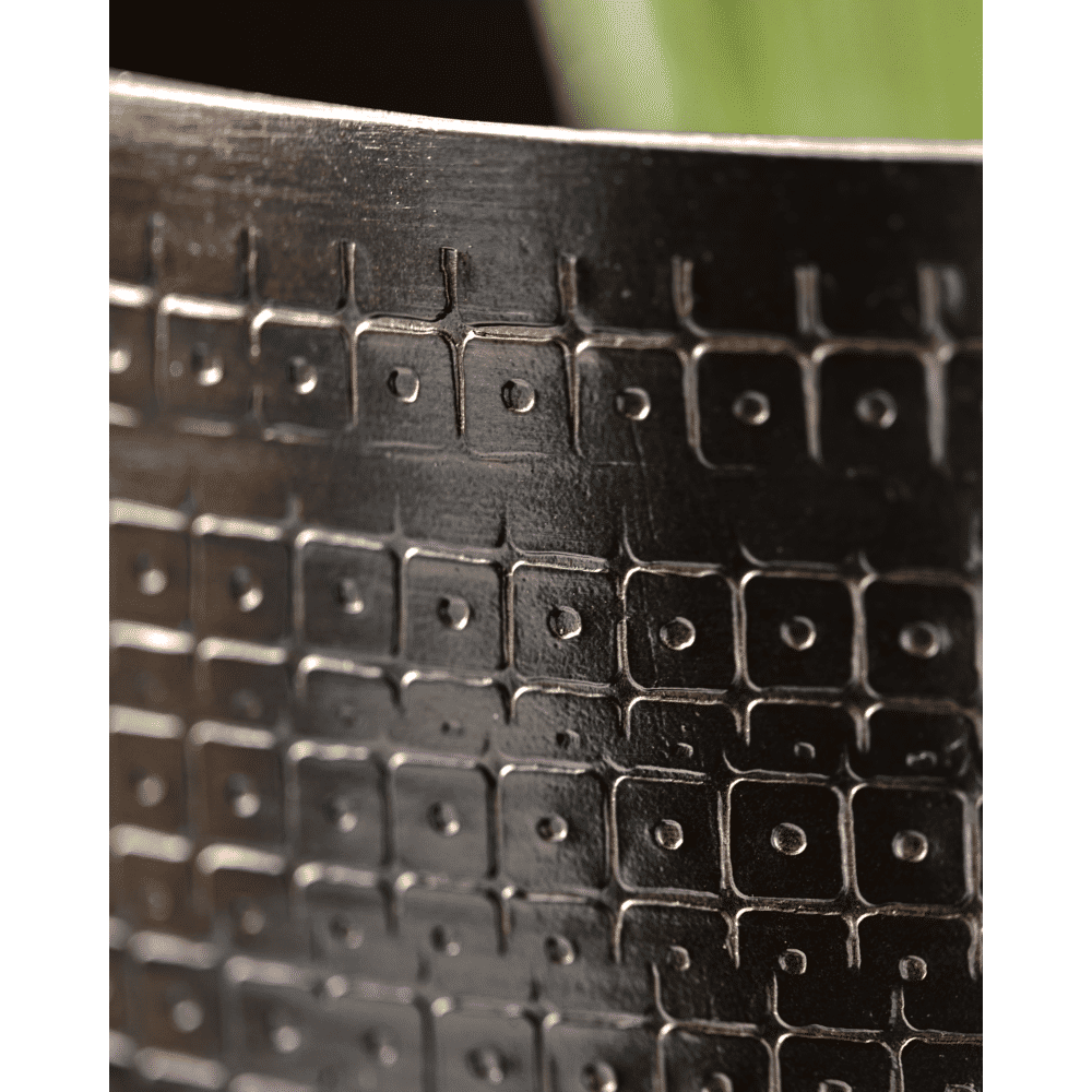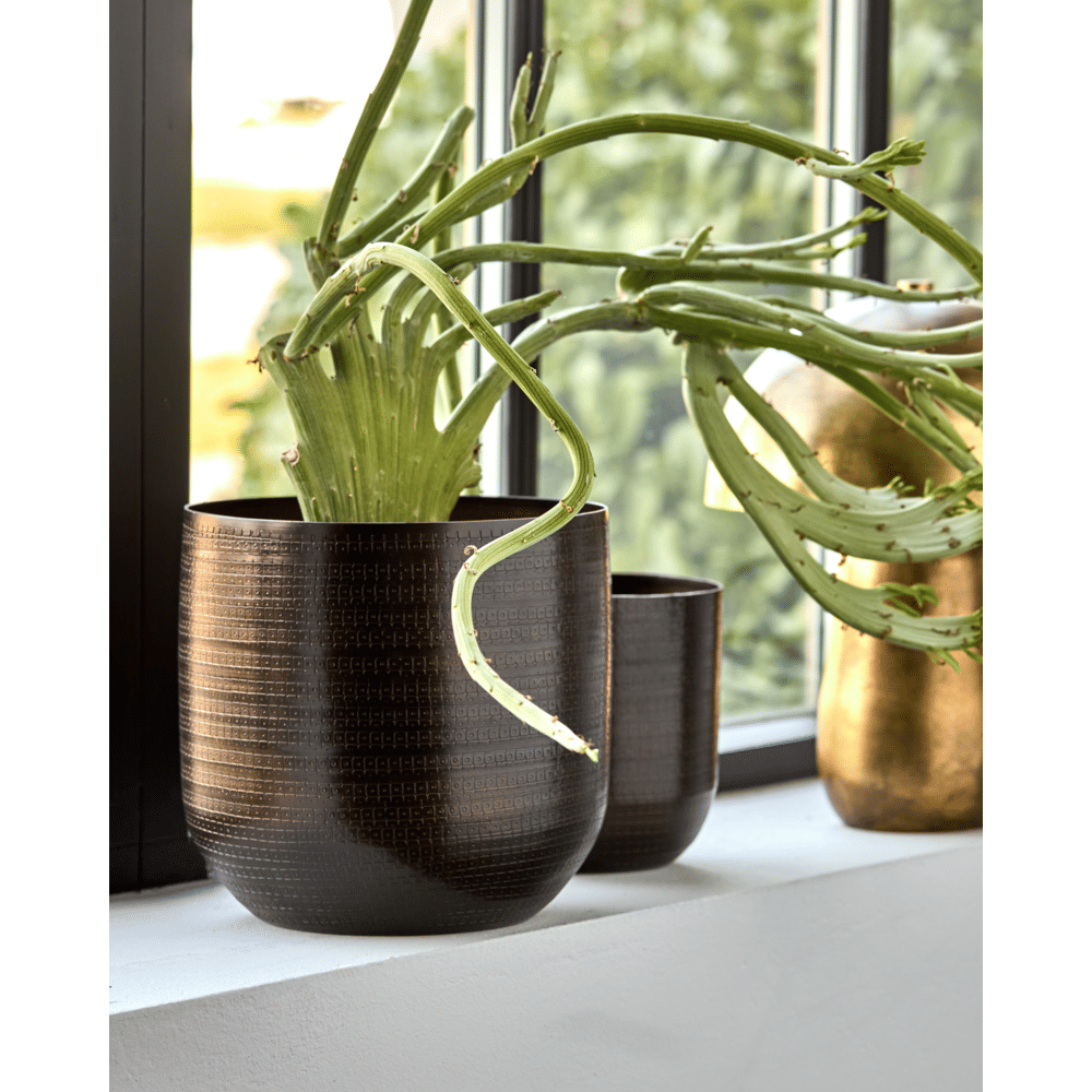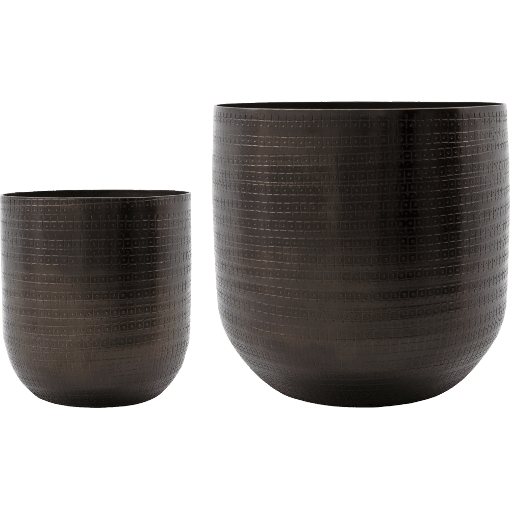 Introduce character and charm to your décor with this exquisite set of planters, designed to complement both green and flowering plants. Crafted from aluminium, each planter boasts an antique brown finish and an intricate embossed pattern. These handmade pieces bring a touch of elegance and sophistication to your living space, enhancing its visual appeal.- Handmade embossed design- Antique brown finish- Aluminium material- Set of two sizesAdd a stylish accent to your home with these beautiful planters.