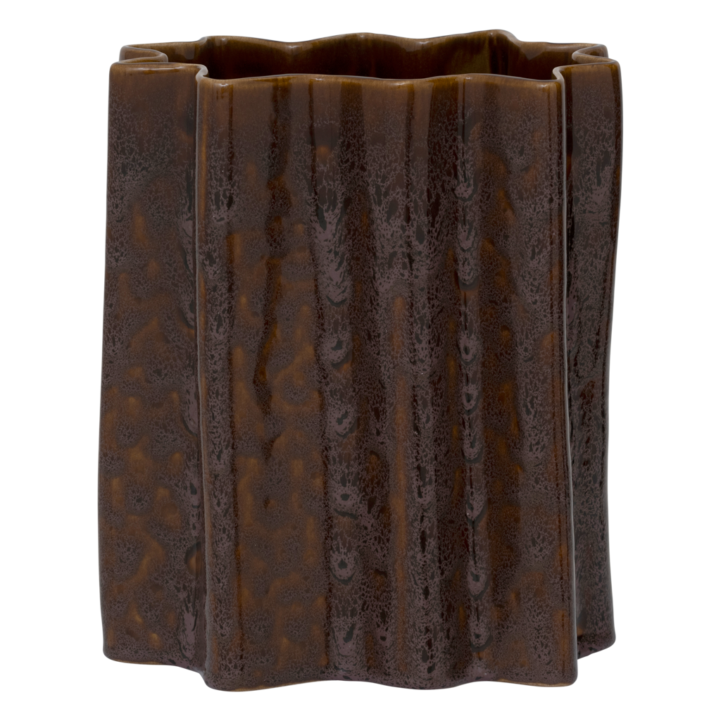 The irregular sculpted body and expressive reactive glaze of this oversized plant pot create an artistic presence in earthy purple-brown tones. Let it elevate a leafy green or sculptural houseplant.