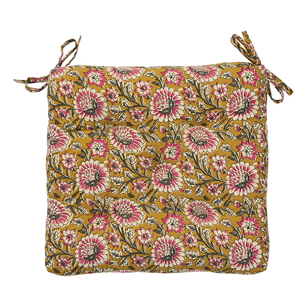Inspired by original Indian block prints, this printed cotton chair pad features a stylish floral print in bold mustard, off white, grey and raspberry. Made from durable cotton with cotton filling, shredded cotton fabric offcuts and secure tie strings, it fits most chairs. Perfect for softening seats in dining, work, reading or sunny garden spaces.