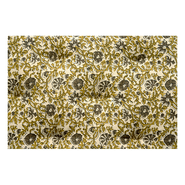 Inside, this printed cotton mattress is filled with shredded cotton fabric leftovers for a sustainable choice that reduces waste while giving a soft, supportive feel. Cotton cover and cotton filling make it breathable and comfortable against the skin. Inspired by original Indian block prints, the floral pattern feels authentic yet understated, perfect for everyday use. Made from durable cotton, it stands up well to frequent sitting, making it ideal for kitchen benches, window seats or terrace benches in muted beige, khaki and dusty green tones.