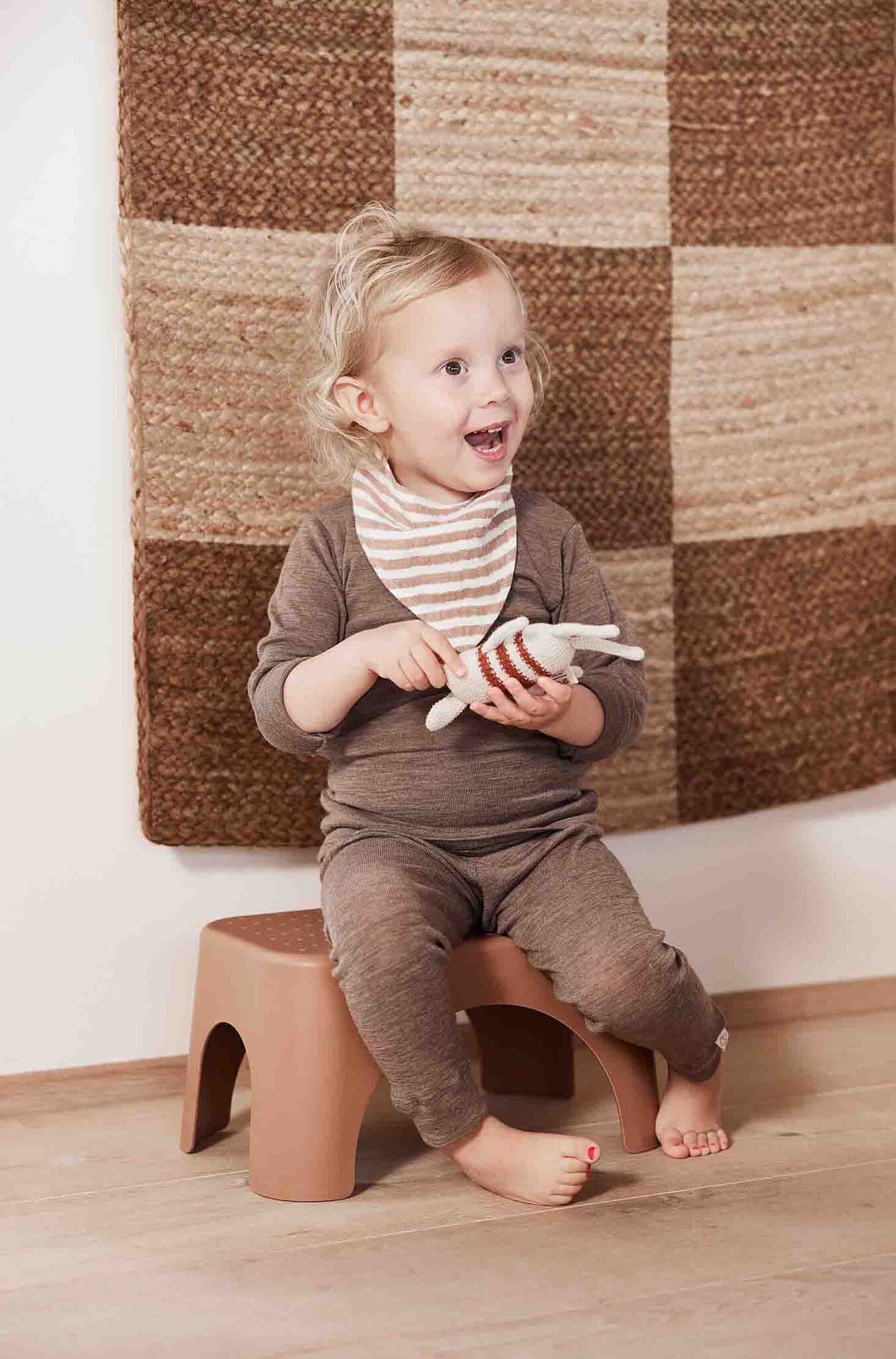 The Rabbit Stool is both functional and playful. Made from sustainable bamboo fibre, this stool can support a maximum weight of 100 kg. With a non-slip surface decorated with small rabbit heads, a feature of the OYOY Mini logo, it ensures safety with a touch of charm. The practical opening in the center facilitates movement for both children and adults. This stool is versatile and stackable and can be used in all rooms. Don't forget the friendly reminder: don't jump! Rubber feet provide stability, making the Rabbit Stool a charming and practical accent for the home. Available in more colours._x000D_