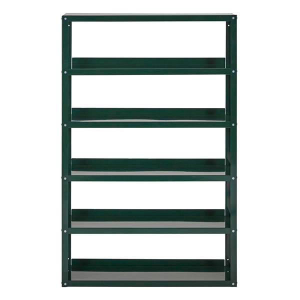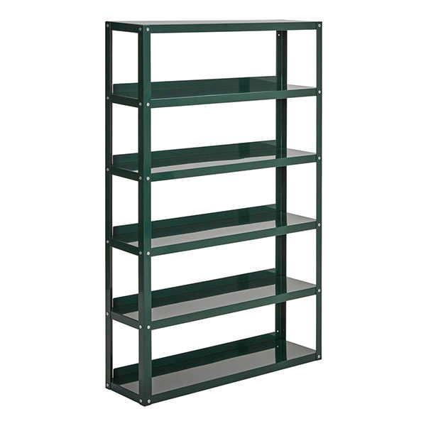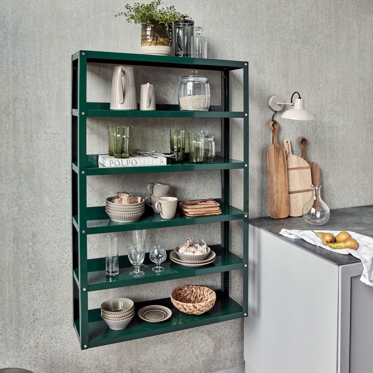 Dit donkergroene rek voegt tijdloze elegantie en functionaliteit toe aan elke ruimte. Gemaakt van duurzaam staal met een glanzende afwerking, heeft het zes planken die elk tot 5 kg kunnen dragen. Perfect om uw huis een persoonlijk tintje te geven, past dit minimalistische ontwerp naadloos in verschillende interieurstijlen.