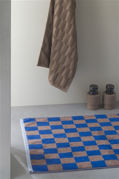 Add colour to your bathroom with the RETRO bath mat from Mette Ditmer. The bath mat has a bright cobalt blue and cognac coloured checkered combination that adds a modern touch to any decor. The light blue border complements the bold colours and creates a harmonious balance, combined with the orange label and strap. The RETRO bath mat is made from 100% organic cotton and is OEKO-TEX® certified, ensuring both softness and durability. For optimal absorbency, it is recommended to soak the bath mat in cold water for 24 hours before the first wash. Material: 100% organic cotton, OEKO-TEX® 100-certified Material: 100% organic cotton, OEKO-TEX® 100-certified - Washing/Care Instructions: Wash at 60° C, tumble dry at maximum heat, avoid fabric softener.