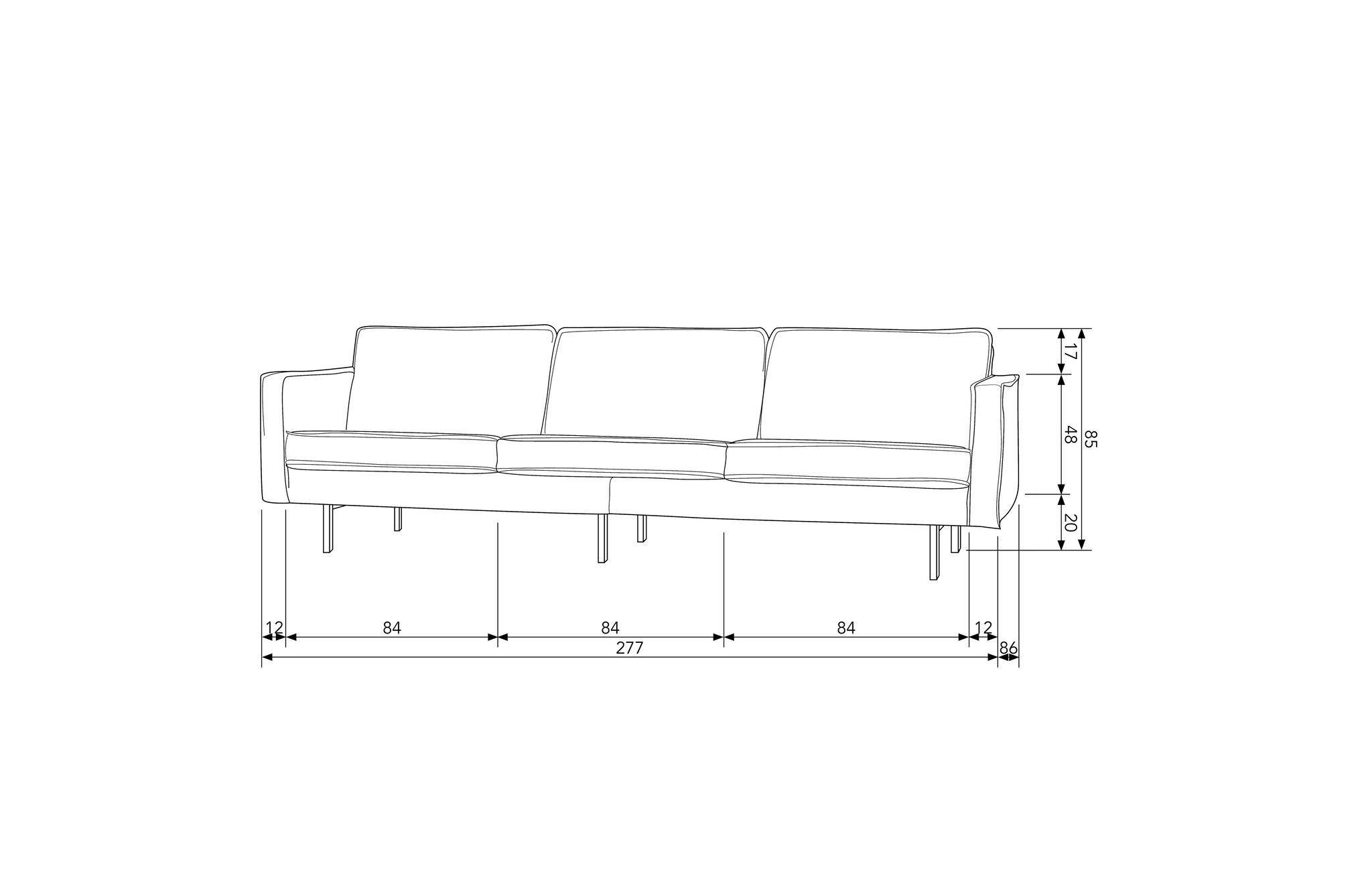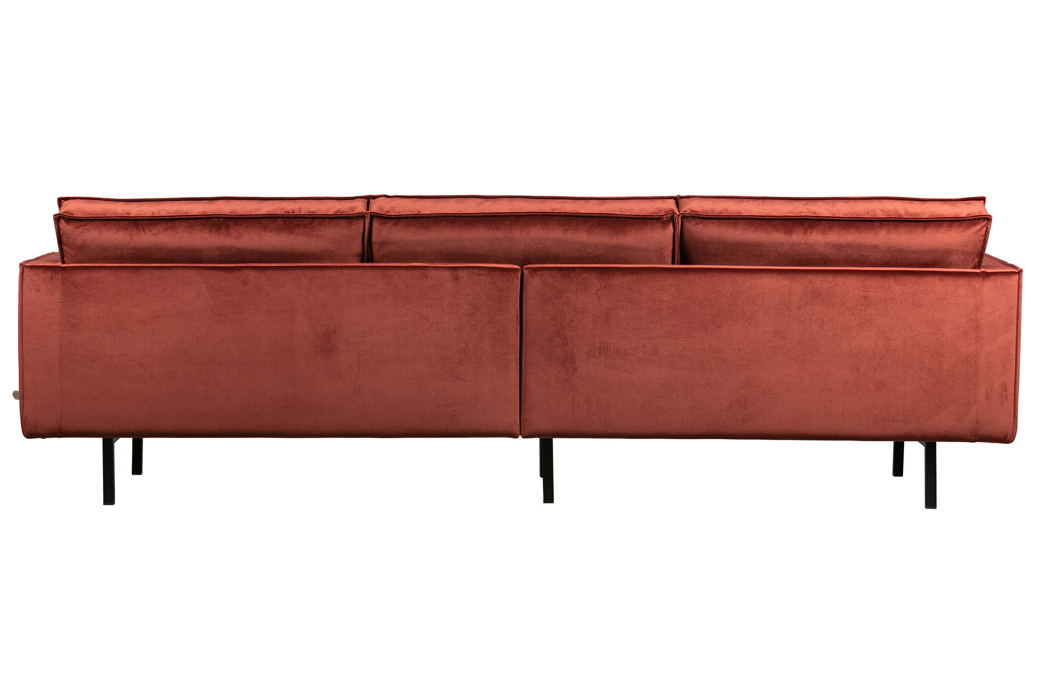 Not available for the UK. This article is not Fire Retardant. - Modern and contemporary design - Part of the famous Rodeo series - Covered in a rich velvet (100% polyester) - H 85 cm x W 277 cm x D 86 cm The Rodeo series by Dutch interior label BePureHome is modern, sturdy and contemporary. The Rodeo's are spacious and offer a wonderfully firm seating comfort. The high leg frame makes the furniture look slender and airy. Rodeo is known for its timeless combination of colours and materials, inspired by the 50's and given a modern twist. Dare to go Rodeo! Material The Rodeo sofa is made of a combination of solid wood, chipboard, polyurethane foam with a density of 25 kg/m3 and a zigzag springs. The seat contains a polyurethane foam with a density of 30 kg/m3 (T3037). The backrest consists of a combination of 70% cut foam and 30% silicone. This Rodeo is upholstered in a rich velvet. Our Jarra velvet fabric has a luxurious look and feel. The fabric feels fine and has a nice light sheen. The Jarra velvet consists of 100% polyester and has a full and heavy quality. The material is therefore suitable for intensive use (Martindale 100,000). Besides the stylish design, the velvet fabric remains beautiful for a long time. Our Jarra fabric will not pill easily and is colourfast. The fabric is, to the surprise of many, a very easy fabric to maintain. Dimensions The Rodeo 3-seater sofa has a total height of 85 cm, width of 277 cm and depth of 86 cm. The seat height is 45 cm and the seat depth is 60 cm, providing fine support. The seat width of this 3-seater is 253 cm and is divided into three separate seat and back cushions. The armrests have a width of 12 cm and a height of 68 cm, measured from the floor. The metal legs are 20 cm high. The sofa can carry 250 kg when evenly distributed. Maintenance Small stains can easily be removed by dabbing with an absorbent cloth. Larger stains can be removed with a mild detergent and a microfibre cloth. If necessary, use a hair dryer to dry the stain more quickly. Keep enough distance so that the fabric does not burn. Afterwards, the fabric can be brushed with a velvet brush. This brush is very good for weekly maintenance. Impregnation is not recommended. If impregnation is deemed necessary it is at your own risk. Delivery The Rodeo 3-seater sofa is delivered in two packages. The legs are easy to attach by using the supplied assembly instructions. To protect hard floors, place felt glides on the underside of the legs. Material: 100% Pes