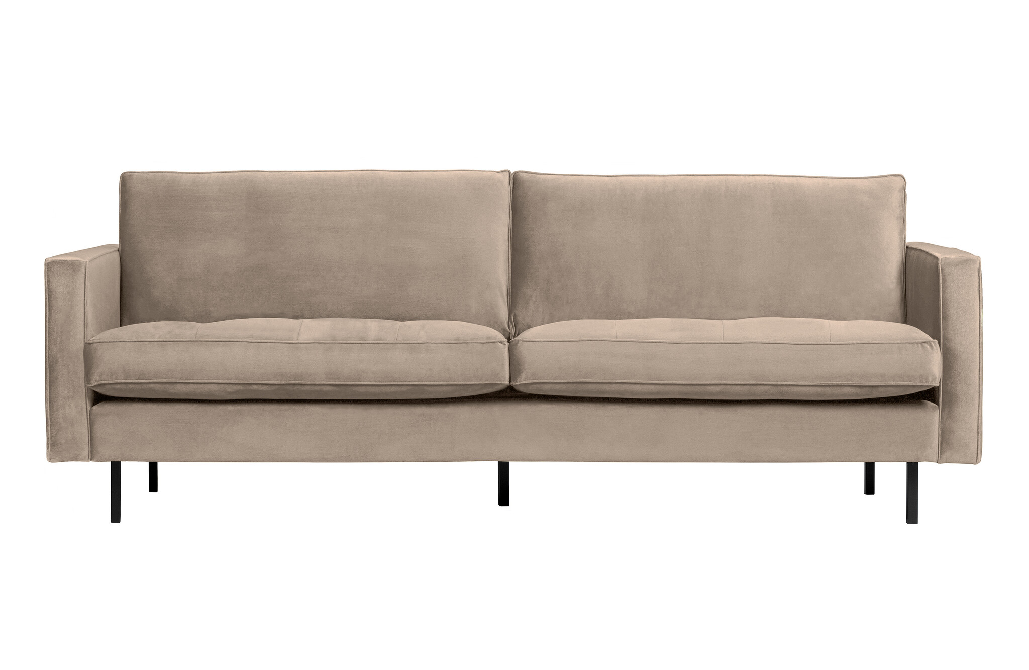 Not available for the UK. This article is not Fire Retardant. - Classic and generous design - Part of the well-known Rodeo Classic series - Covered in a rich velvet (100% polyester) - H 83 cm x W 230 cm x D 88 cm The Rodeo series by Dutch interior label BePureHome is modern, sturdy and contemporary. The Rodeo's are spacious and offer a wonderfully firm seating comfort. The high leg frame makes the furniture look slender and airy. Rodeo is known for its timeless combination of colours and materials, inspired by the 50's and given a modern twist. The classic twist of the Classic Series is characterized by the outward stitched seams and the quilted seat cushions. Dare to go Rodeo! Material The Rodeo Classic sofa is made of a combination of solid wood [fsc], plywood [fsc], chipboard [fsc], polyurethane foam with a density of 30 kg/m3 and a zigzag springs. The backrest consists of a combination of 70% cut foam and 30% silicone. This Rodeo is upholstered in a rich velvet. Our Jarra velvet fabric has a luxurious look and feel. The fabric feels fine and has a nice light sheen. The Jarra velvet consists of 100% polyester and has a full and heavy quality. The material is therefore suitable for intensive use (Martindale 100,000). Besides the stylish design, the velvet fabric remains beautiful for a long time. Our Jarra fabric will not pill easily and is colourfast. The fabric is, to the surprise of many, a very easy fabric to maintain. Dimensions The Rodeo Classic 2,5-seater sofa has a total height of 83 cm, width of 230 cm and depth of 88 cm. The seat height is 47 cm and the seat depth is 58 cm, creating a comfortable and supportive sitting position. The seat width of this 2.5-seater is 206 cm and is divided into two separate seat and back cushions. The armrests have a width of 12 cm and a height of 70 cm, measured from the floor. The metal legs are 16 cm high. The sofa can carry 200 kg when evenly distributed. Maintenance Small stains can easily be removed by dabbing with an absorbent cloth. Larger stains can be removed with a mild detergent and a microfibre cloth. If necessary, use a hair dryer to dry the stain more quickly. Keep enough distance so that the fabric does not burn. Afterwards, the fabric can be brushed with a velvet brush. This brush is very good for weekly maintenance. Impregnation is not recommended. If impregnation is deemed necessary it is at your own risk. Delivery The Rodeo Classic 2,5-seater sofa is delivered in one package. The legs are easy to attach by following the supplied assembly instructions. To protect hard floors, place felt glides on the underside of the legs. Material: 100% Pes