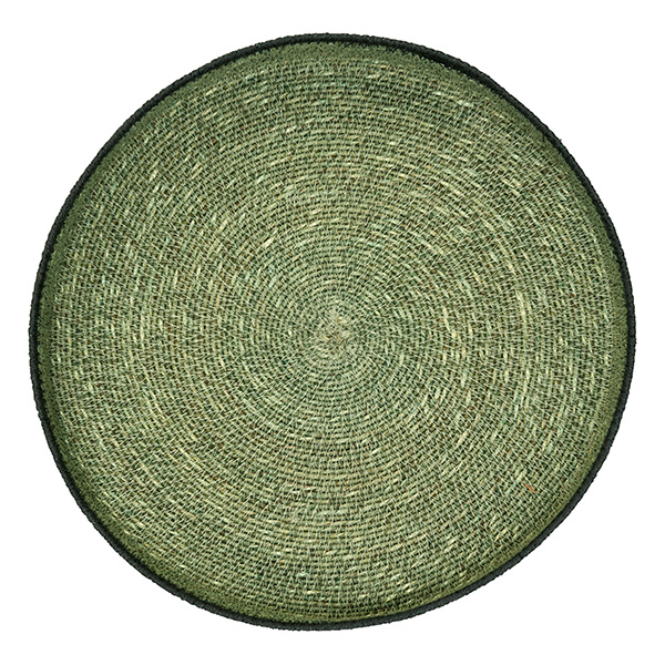 With this round seagrass tray, natural Seagrass is a sustainable, biodegradable natural resource that leaves no harmful residue in the environment. Fast growth cycle. For the eco-conscious customer. Dyed seagrass, machine hand-stitched with cotton thread. Material and craft skills come together in perfect harmony. Skilled makers shape the seagrass into a stable, circular form, while fine stitching in cotton locks the structure in place. The subtle green, black finish adds depth without feeling heavy, giving a calm, grounded mood to your home.