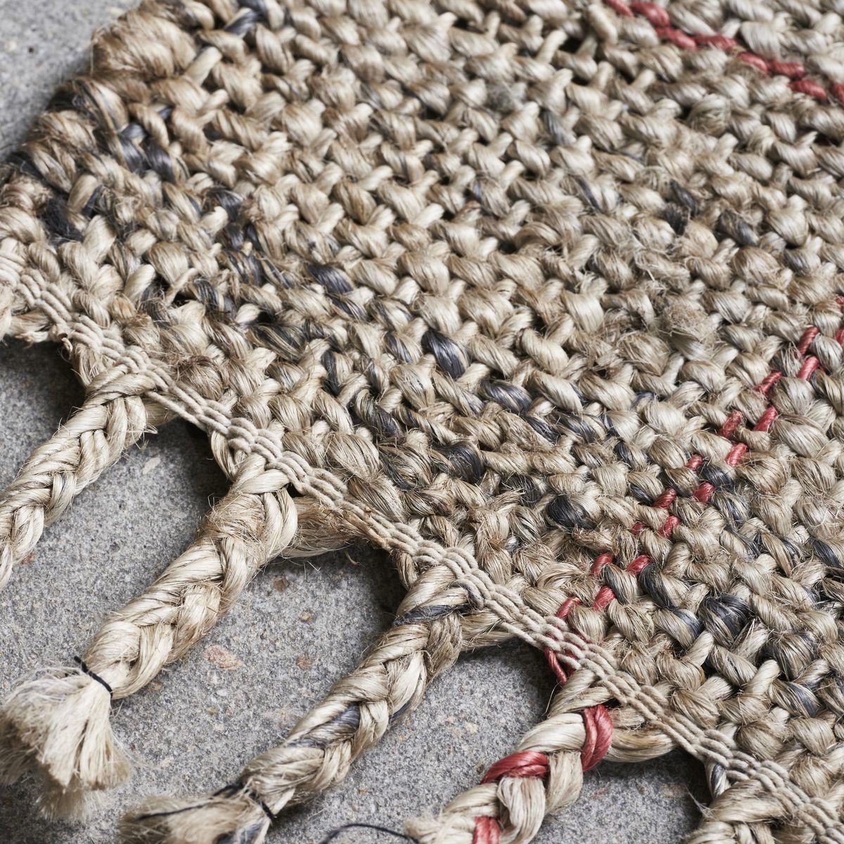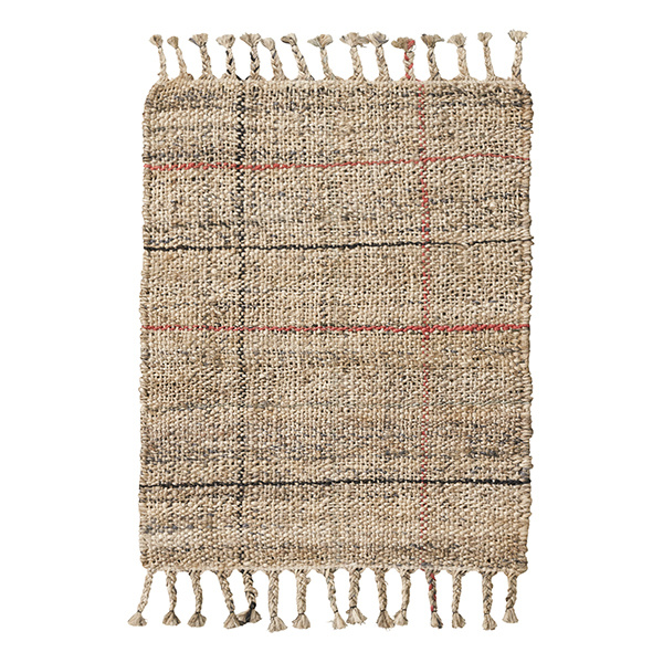 The handmade, small Atur rug from House Doctor gives off a laid back feel with its neutral colours and thick fringes. Subtle black and red stripes create a large check pattern that blends in rather than standing out. Thanks to the combination of jute and cotton, Atur is the versatile and durable choice. Place it wherever you need to define an area and add extra softness. At the end of your bed, by a floor mirror or underneath a small side table. Material: Jute, Cotton Care instructions: Do not wash, Do not bleach, Do not tumble dry, Do not iron, Do not dry clean