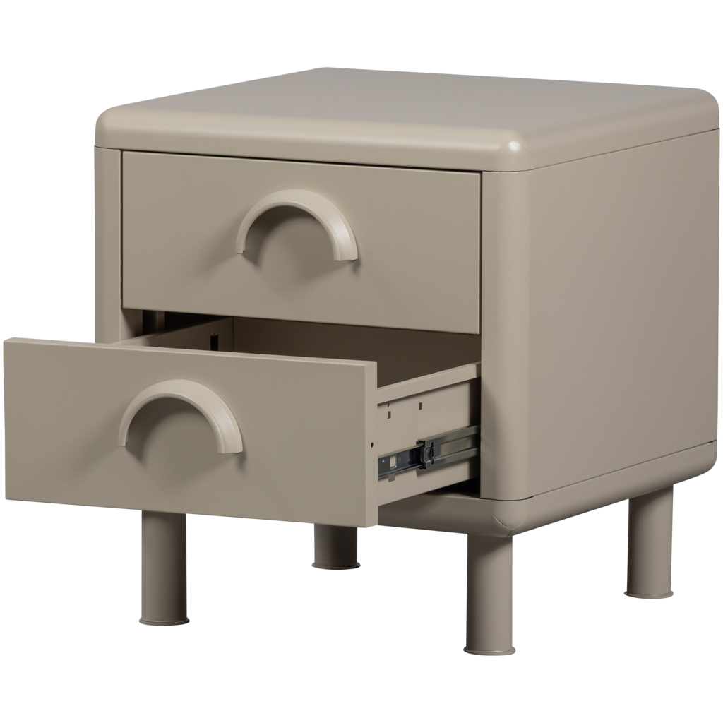 - Vervaardigd uit metaal - Met speelse handgrepen - Cilinder vormige poten - H 45 cm x B 42 cm x D 42 cm Rune is een opvallend ladekastje met een retro design uit de collectie van het Nederlandse merk WOOOD. Dit speelse opbergertje is uitgerust met twee lades, elk voorzien van een boogvormige handgreep. Rune biedt genoeg ruimte om diverse spullen netjes en uit het zicht op te bergen, waardoor het niet alleen praktisch is als nachtkastje, maar ook uitstekend dienst doet als compacte ladekast in andere ruimtes. Kenmerken De afgeronde hoeken van Rune zijn gevormd door geknipt en zorgvuldig gebogen metaal. Door deze techniek zijn de naden enigszins zichtbaar en in enkele gevallen niet volledig gesloten. Het metaal met poedercoating zorgt voor een luxueuze uitstraling en zijn levenslang beschermt. Een poedercoating is een lak welke met behulp van hoge temperaturen aan het metaal gehecht wordt. Een poedercoating zorgt voor een volledige kleurdekking en kent een matte of (licht)glanzende afwerking. Afmetingen - Hoogte: 45 cm - Breedte: 42 cm - Diepte: 42 cm - Poothoogte: 11 cm - Diameter poot: 4,5 cm - Afstand van poot tot buitenzijde: 2,5 cm - Hoogte ladefront: 14 cm - Breedte ladefront: 35 cm - Hoogte lade-inhoud:10 cm - Breedte lade-inhoud: 32 cm - Diepte lade-inhoud: 36 cm - Hoogte handgreep: 6 cm - Breedte handgreep: 11,5 cm - Gewicht: 12 kg - Draaggewicht per lade: 12 kg Onderhoud Al onze metalen uit de collectie zijn grondig behandeld en vragen dus niet om een herbehandeling. Behandeld metaal is eenvoudig schoon te houden met een lichtvochtige doek, het nadrogen van het oppervlak zorgt voor een streeploos resultaat. Levering Het artikel wordt in een pakket geleverd en is eenvoudig te monteren aan de hand van de bijgeleverde montagehandleiding. Plaats voor het beschermen van harde vloeren viltglijders aan de onderzijde van de poten.