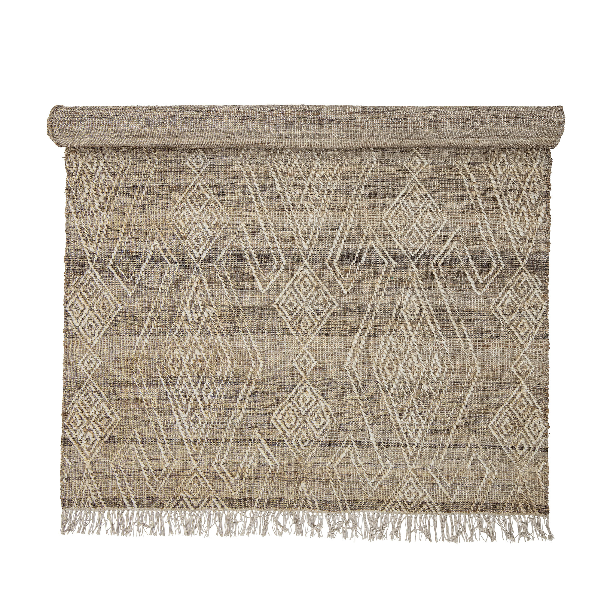 The Rupen Rug by Bloomingville is a beautiful woven rug made of jute and wool. The rug has a nice tone on tone pattern in nature colors with small fringes at both ends. Its touch is so comfortable that you will always want to go barefoot on it. Material: 48% Jute, 27% Wool, 16% Cotton, 7% PO, 2% OF, Washing instructions: Spot clean only