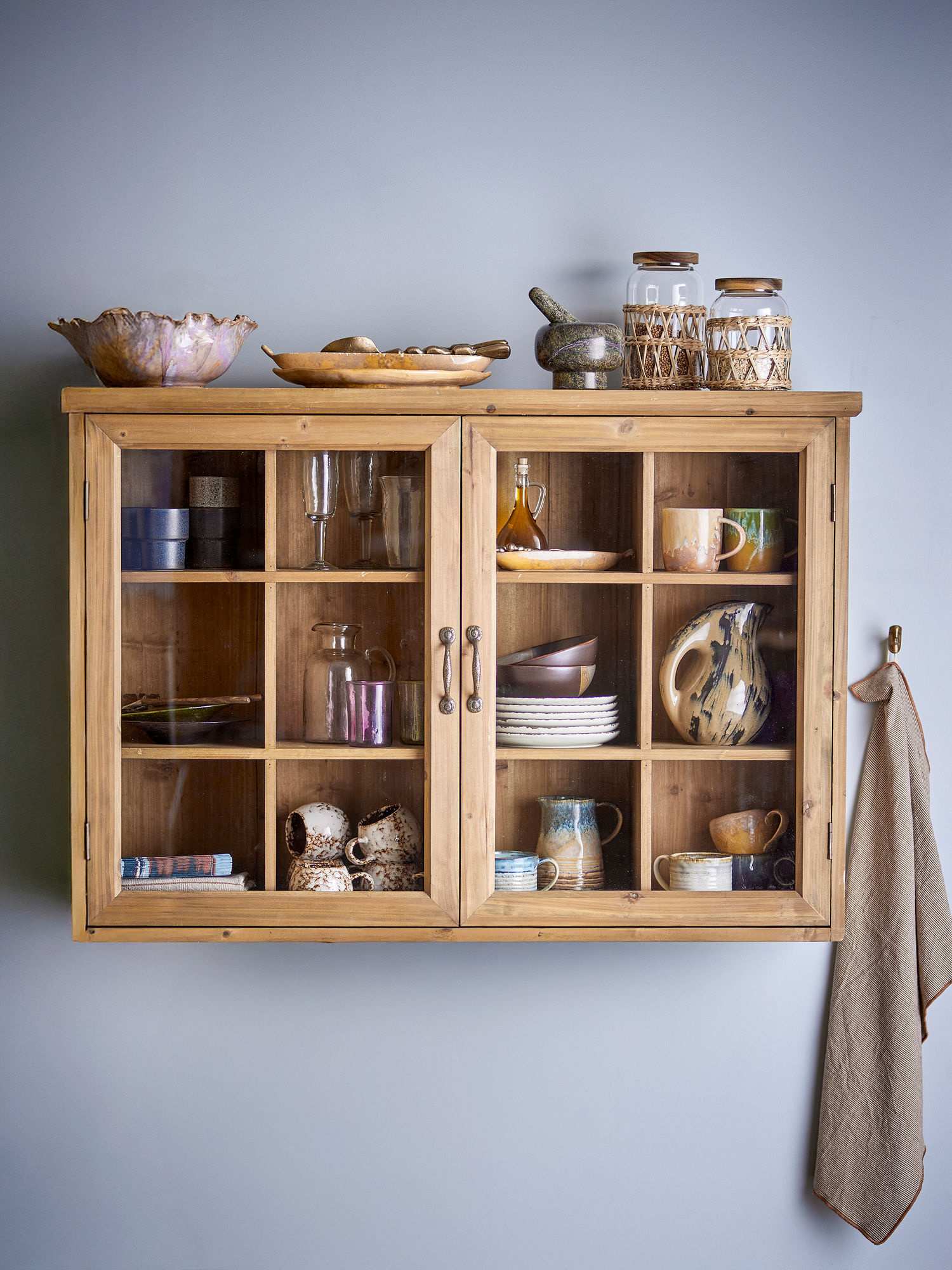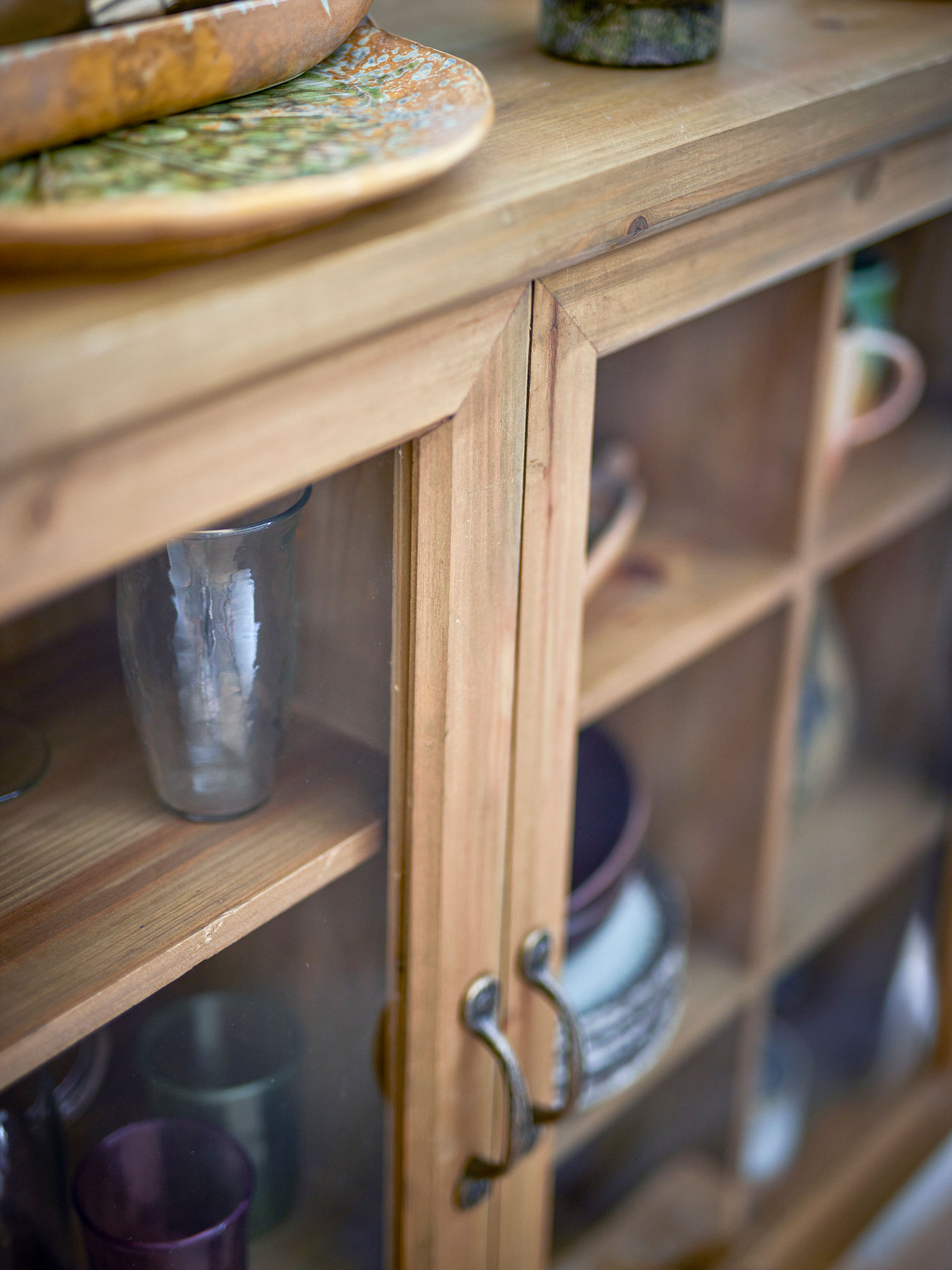 The Ruthie Cabinet by Bloomingville is a small pine cabinet with glass doors and small compartments. The decorative handles and warm wood give it a rustic and charming look. The Cabinet is ideal for storing and displaying your favorite things.
