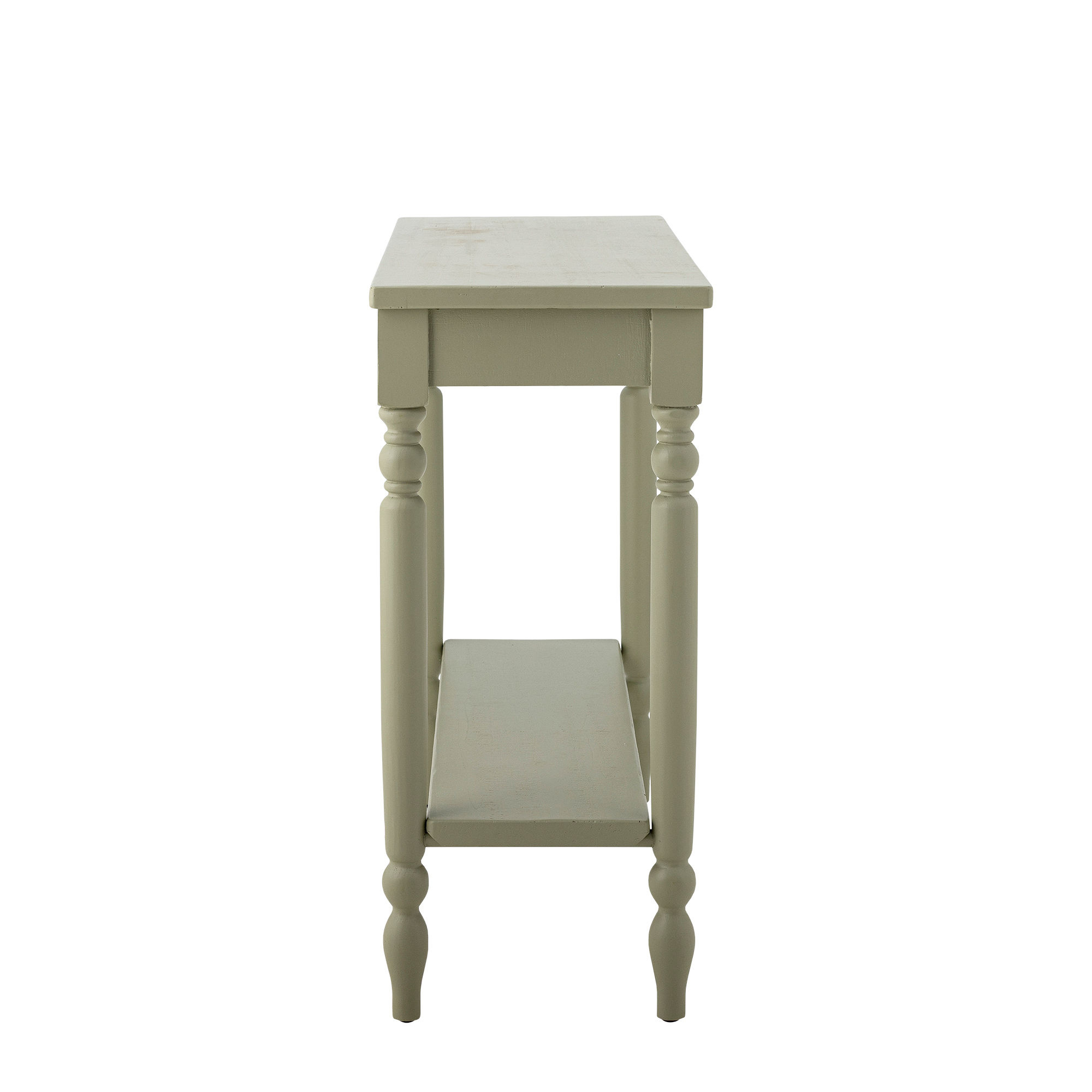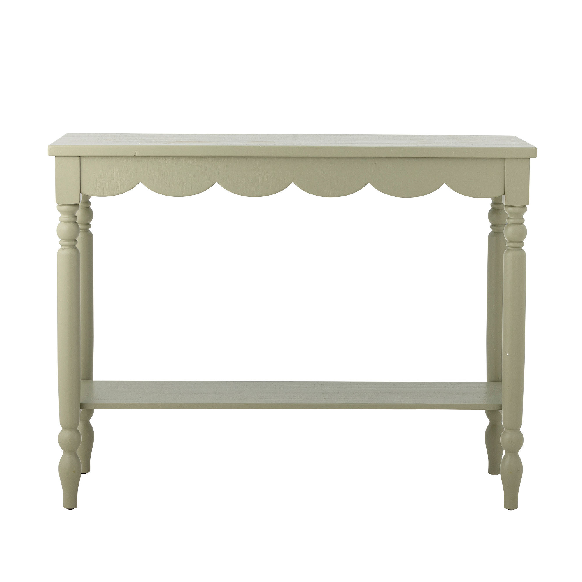 The Salla Console Table by Creative Collection is made of pine and painted in a dusty green color with a subtle patina. The wavy edge of the tabletop and the extra shelf give the table a decorative look and practical functionality.