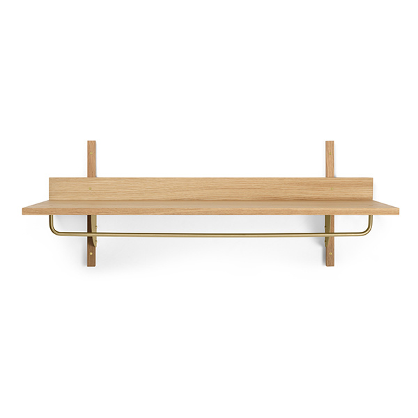 A new and modern take on mid-century shelving units, Sector is defined by its sturdy simplicity and classic combination of wood and brass. Use it on its own in your hallway area to hang your coat, or together with other elements from the Sector collection, as a way to create a functional dressing area in the bedroom. Care instructions: Wipe with a damp cloth. Do not leave the surface wet Material: Shelf: Natural oak veneer with plywood core. Profiles: Natural solid oak. Brackets and rod: Brass Product note: The shelf can hold up to 20 kg, provided it has been properly mounted onto an appropriate wall. The included rawlplugs can only be used for brick or concrete walls. Registered design Sustainability note: