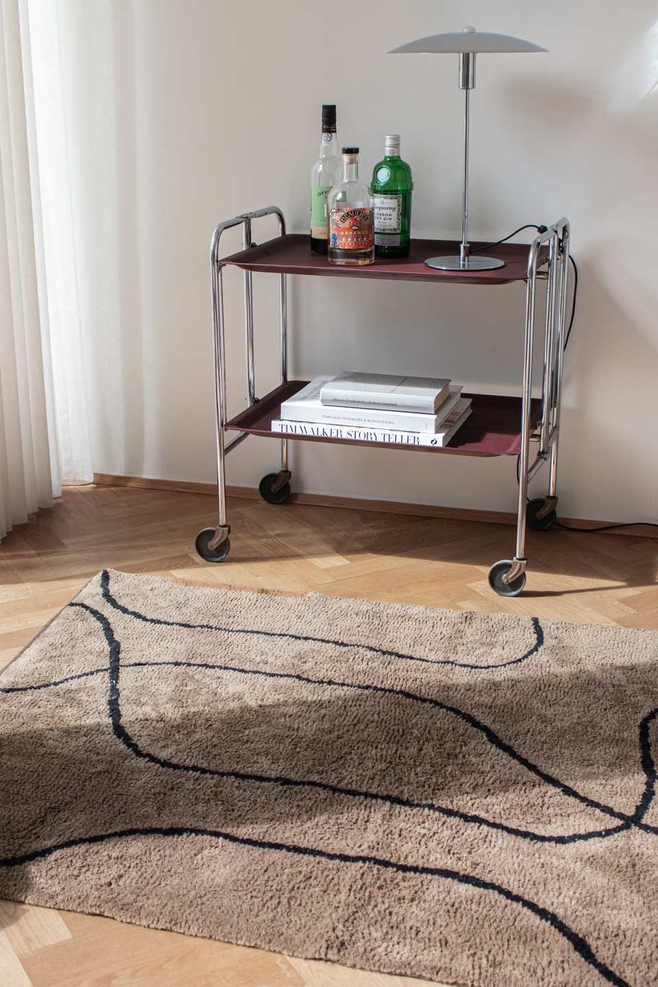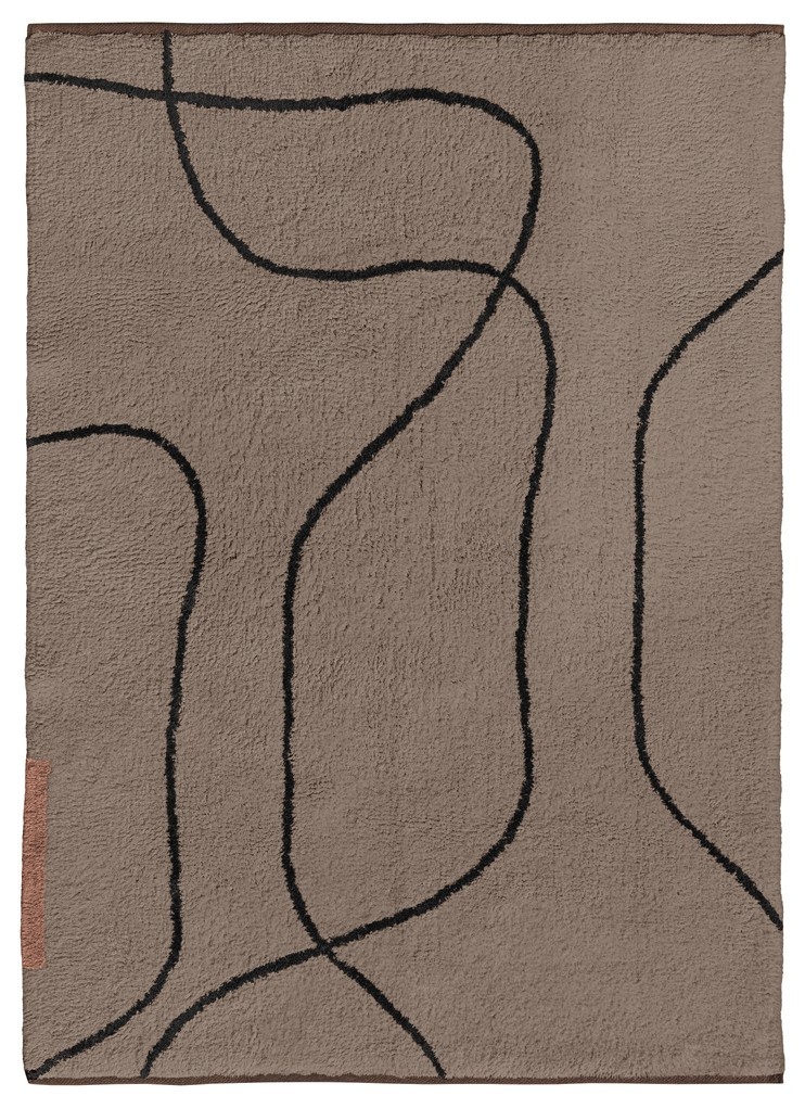 A soft, decorative rug that brings together organic shapes and subtle graphic detailing. The SHADOW rug in light brown is crafted in a heavy tufted quality that lies flat and stable on the floor – ideal beneath a lounge chair or in a quiet corner in need of softness and warmth. A dark brown border frames the design and completes the look. - Material: 100% cotton, OEKO-TEX® 100-certified, rubber back - Washing/Care Instructions: Wash at 30° C gentle. Use detergent without bleach. Tumble dry on low temperature.