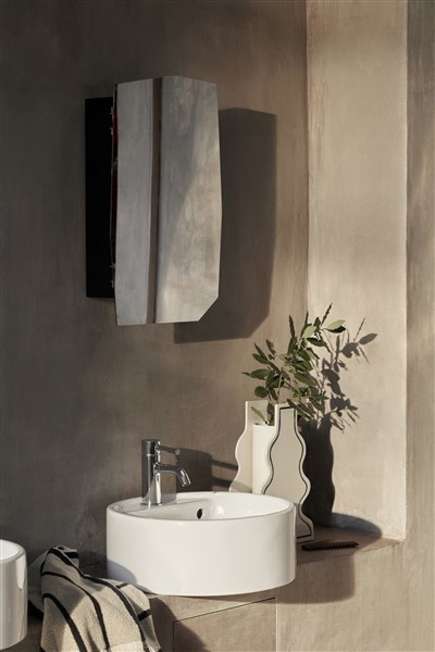 Add a striking expression to your home with the functional and intriguing Shard Mirror Cabinet. Its name references the inspiration behind the mirror, which rose from looking at the sharp, raw edges on pieces of broken ceramic, glass and rock. The asymmetrical mirror, which is made of stainless steel, elegantly hides the powder-coated metal cabinet, resulting in a beautiful reinterpretation of the classic, functional mirror cabinet. Use the shelves in the Shard Mirror Cabinet to store skincare in the bathroom, or for holding smaller items like keys and other personal trinkets in the hallway. Care: Wipe with a damp cloth or gently clean with a soft sponge and mild detergent Material: Powder coated galvanized iron and stainless steel with mirror polish Productnote: Max. weight capacity 10 kg. Cabinet: H: 45.5 x W: 30.2 x D: 11 cm / H: 17,9 x W: 11,9 x D: 4,3 in. Registered design
