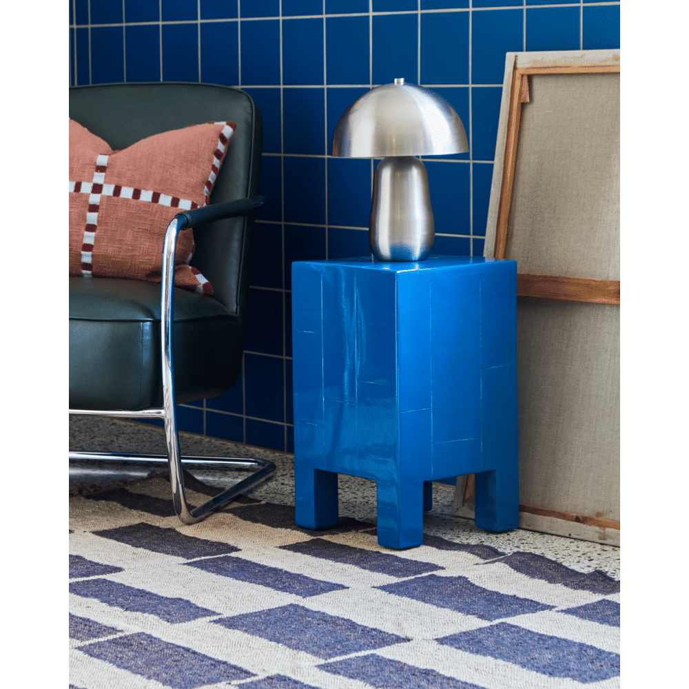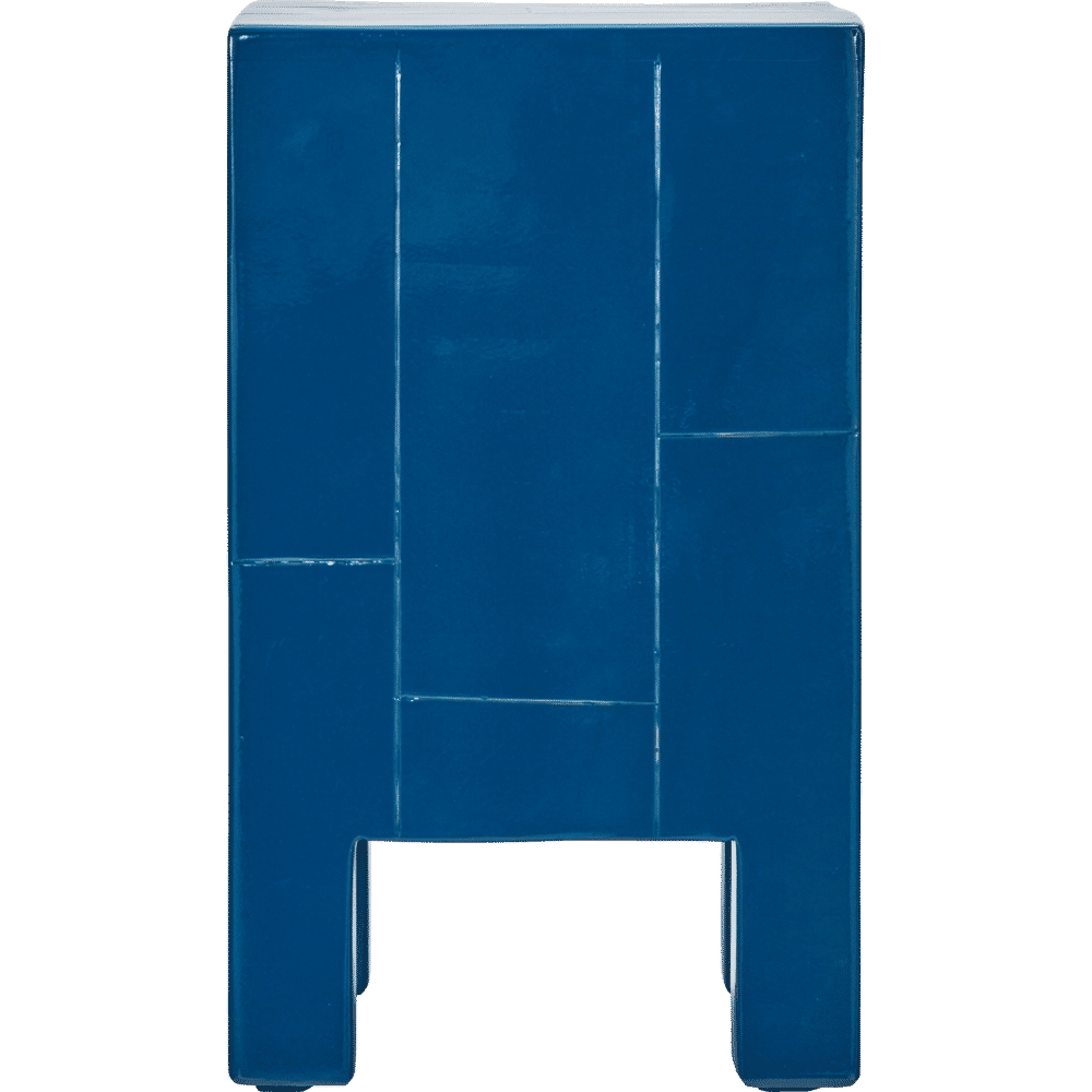 This high gloss blue side table doubles as a sculptural focal point for your living room or bedroom.Perfect as a coffee table, or a side table.Mango wood tiles bring a tactile, handmade finish, while the bold lacquered colour ensures it stands out in your interior.Style it with a favourite vase or lamp to add personality and energy.- Handmade craftsmanship- High gloss blue finish- Mango wood tile detailing- Multiple styling optionsLet it set an artistic tone and give your home a burst of colour. Material:Primary: MDF (100%) Frame: Mango Wood (50%),Iron (50%) Inhoud: Foodsafe: Martindale: Montage vereist: No Ja Onderhoud / reiniging: Clean with a dry cloth, Do not use detergents