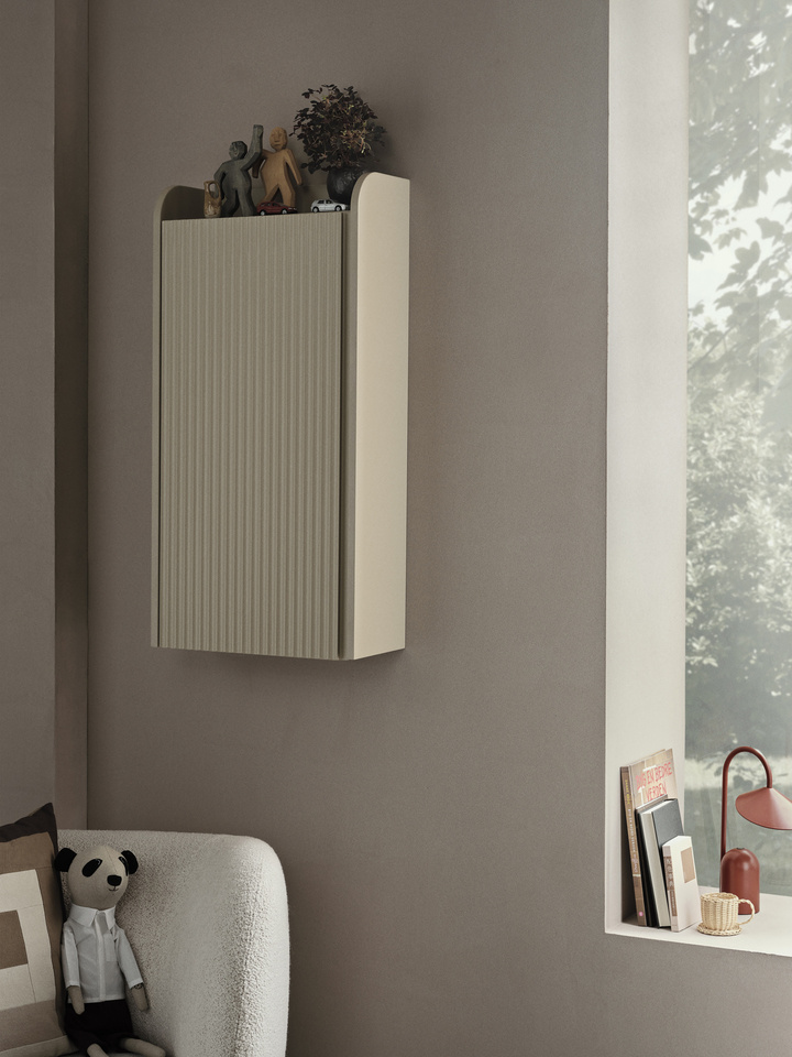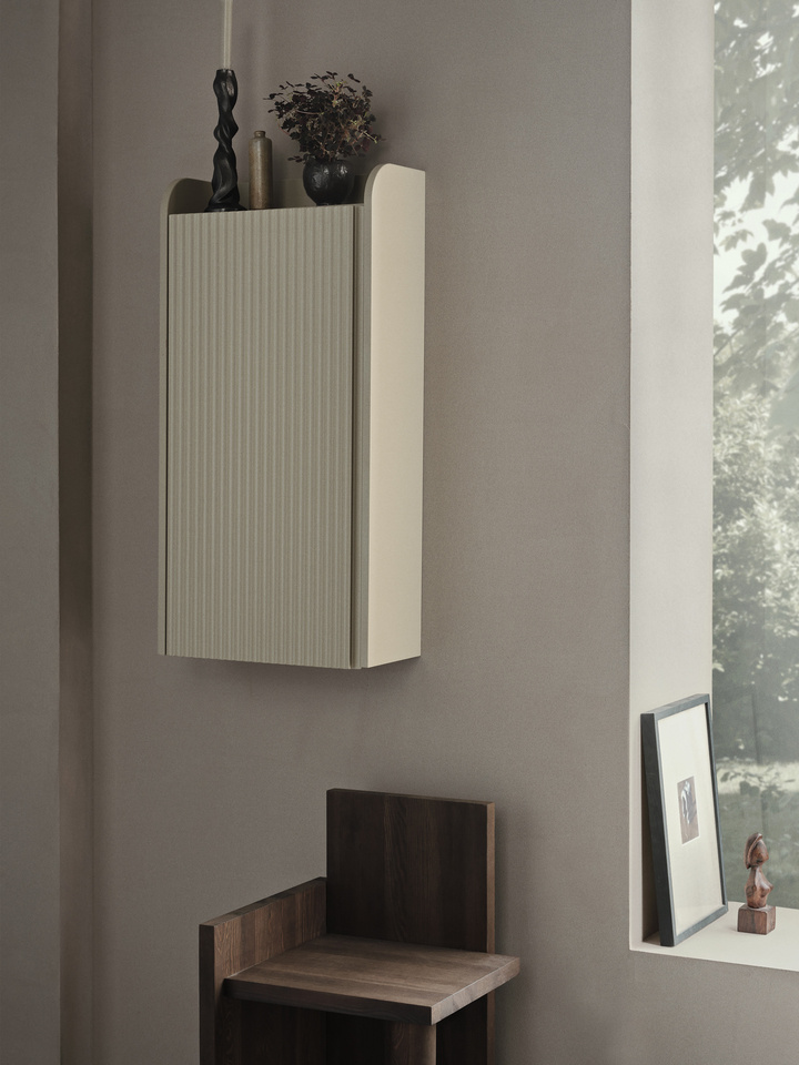 The Sill Wall Cabinet is FSC™ certified, crafted from MDF and offers a decorative and multipurpose storage solution. The name Sill stems from the French sillon, meaning carved grooves, which adorn the doors of the wall cabinet. Use the versatile and functional Sill Wall Cabinet throughout your home – for your favourite cups in the kitchen, for your most cherished treasures in the living room or for keys and other miscellaneous items in the hallway. Additionally, you have the option to choose the door opening on the left or on the right, tailoring it to your space and preferences. Material: FSC™ Mix certified VMDF and laminate with carved doors. Painted. Responsibility note: FSC™ Certified. Product note: Registered design. Care instructions: Wipe with a damp cloth