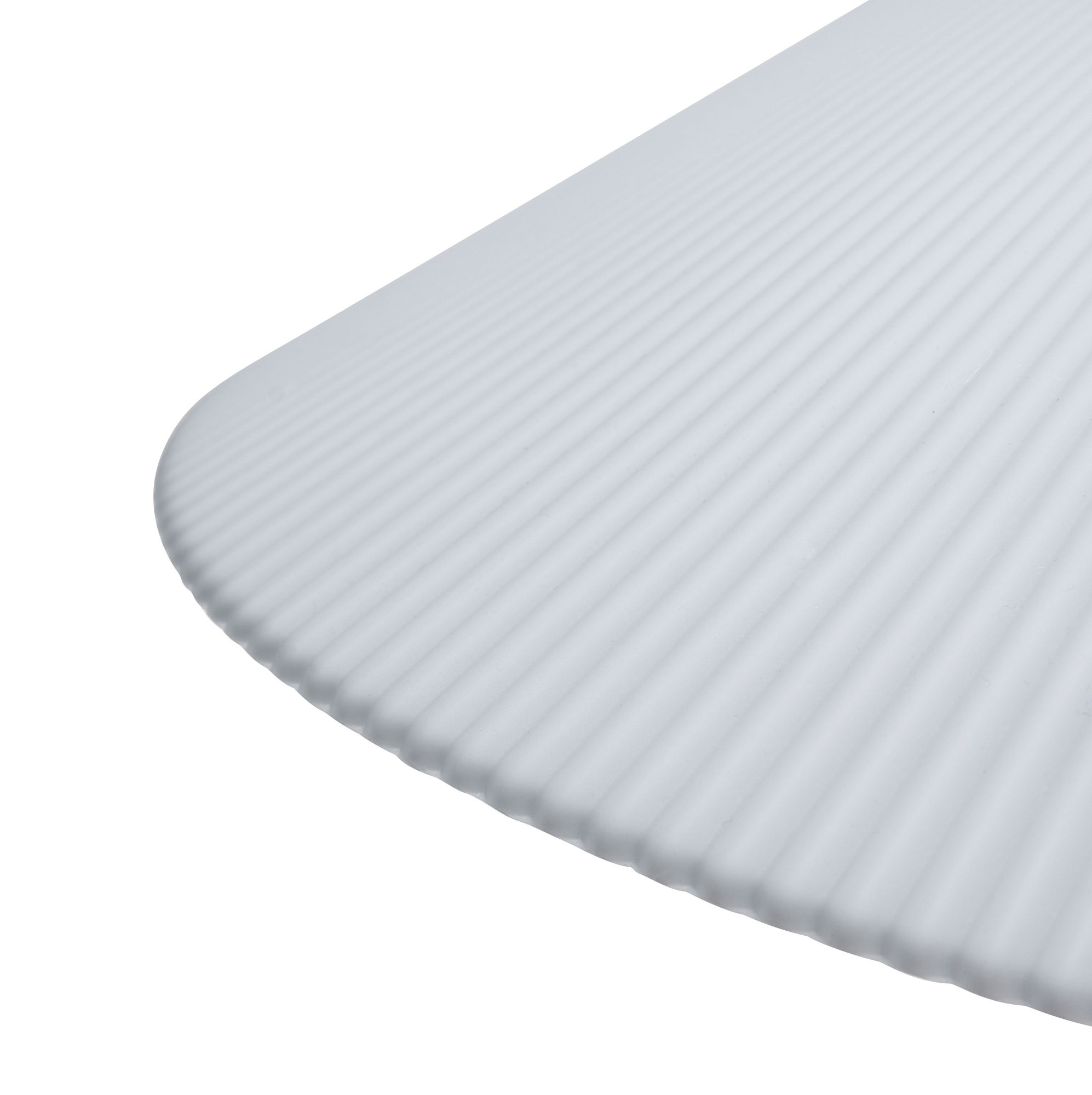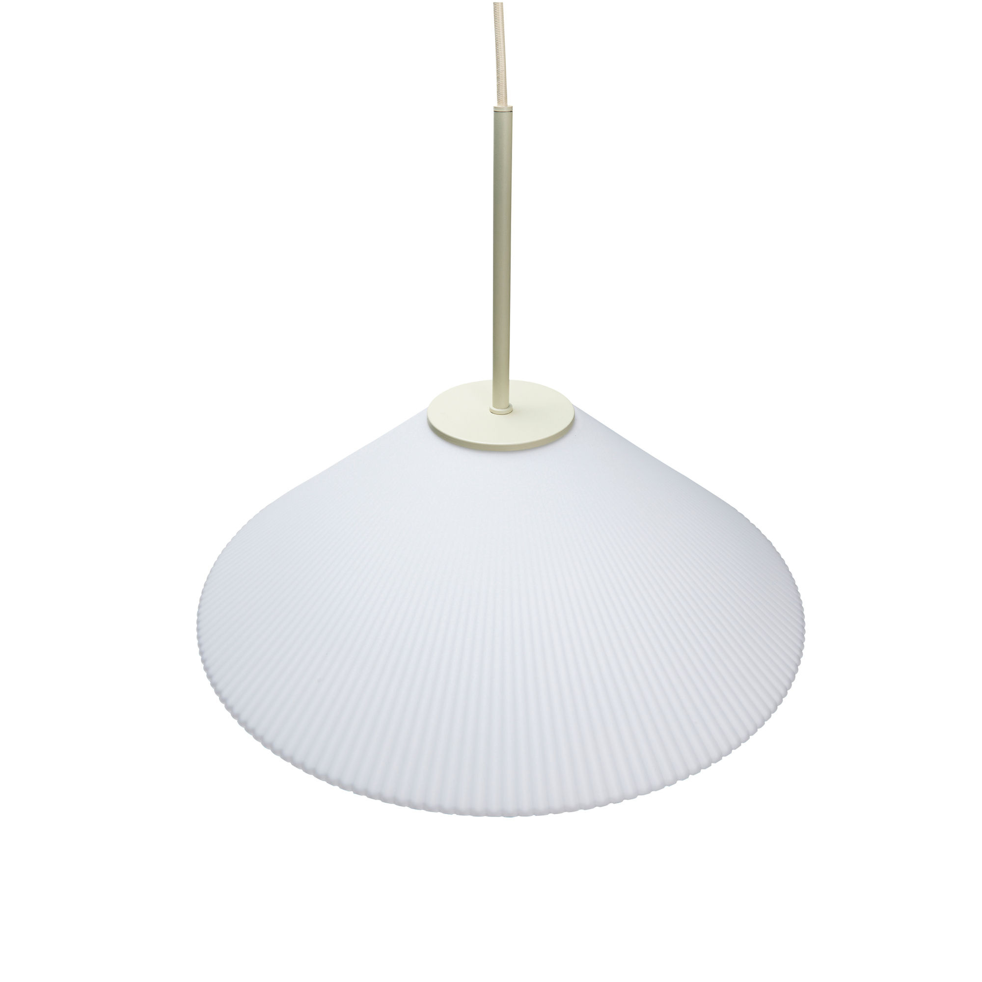 White ridged glass pendant lamp with beige fabric cord baldachin.