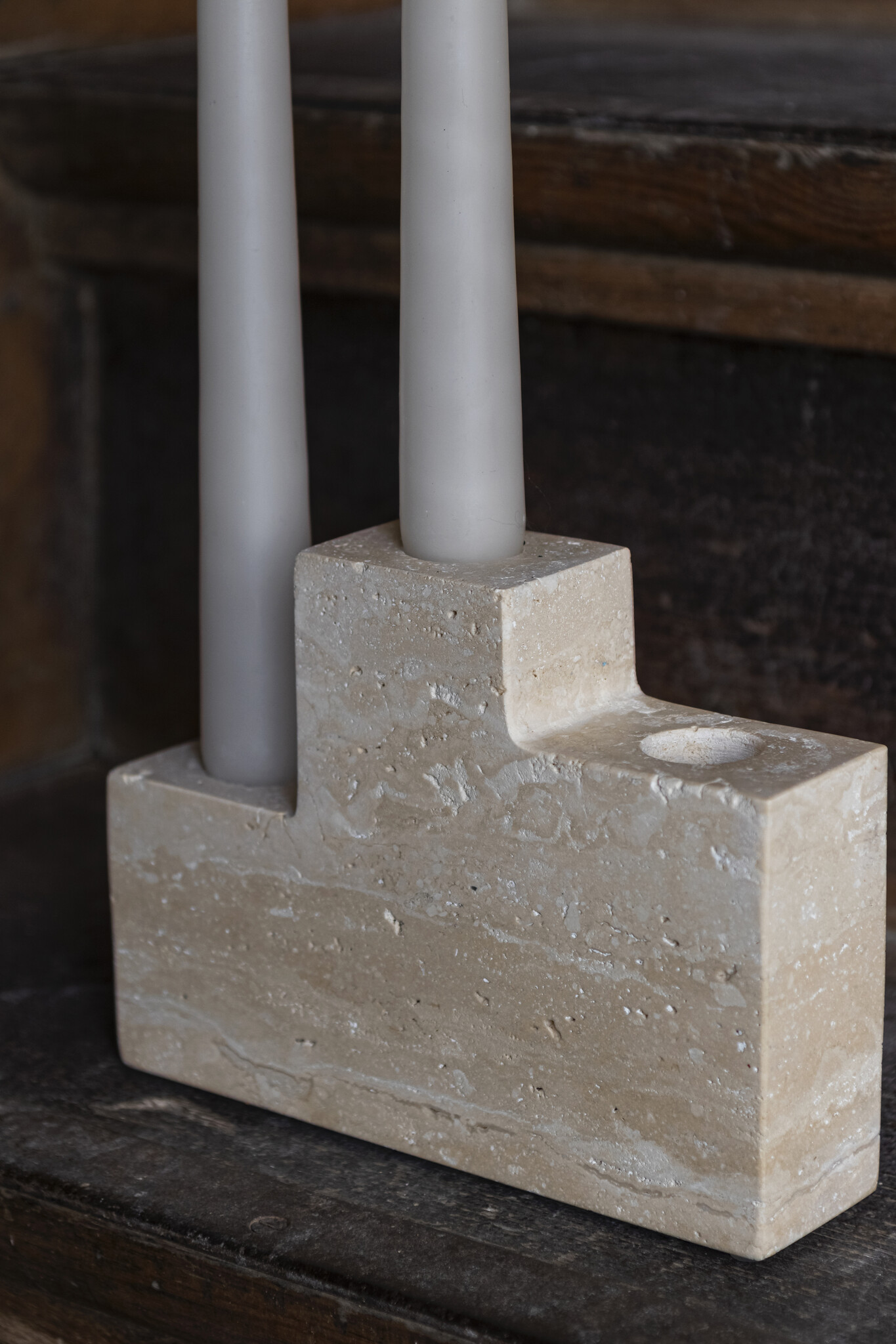 With space for three candles, the candleholder is perfect as a standalone statement piece or as part of a larger still life. Its step-inspired design highlights the unique details of the material, making it a stylish addition to any interior. - Washing/Care Instructions: Wash by hand or use a damp cloth. We recommend general diswashing soap. Does not tolerate acidic cleaning agents. The product is not suitable for the dishwasher. - Washing/Care Instructions: Wash by hand or use a damp cloth. We recommend general diswashing soap. Does not tolerate acidic cleaning agents. The product is not suitable for the dishwasher. - Material Composition: Travertine
