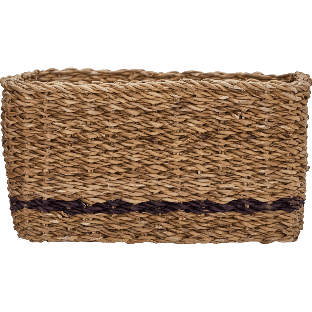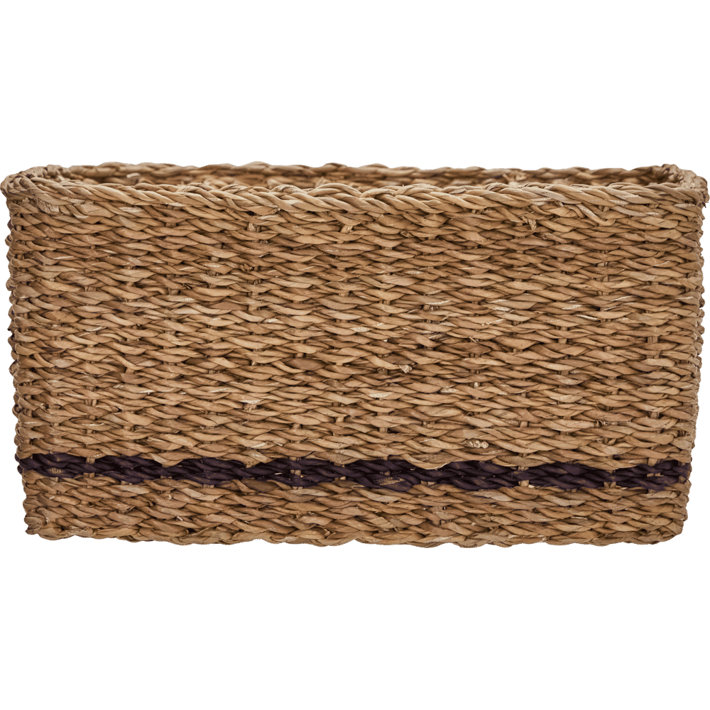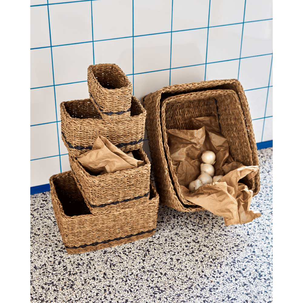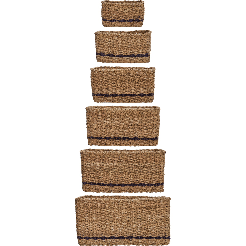 Organise everyday essentials while adding warmth to your home with these handmade storage baskets. The natural seagrass complemented by a single black stripe makes each basket a subtle statement, and the square, practical shape brings easy order to any setting. Use them in your hallway for keys and gloves, in the living room for magazines, or in the bathroom for towels - let your creativity lead the way.- Handmade from natural seagrass.- Subtle black stripe detail.- Set of 6 baskets.- Square, practical design.Tidy up your space and style with baskets that fit anywhere you need extra storage or decorative flair. Material:Primary: Seagrass (100%) Inhoud: Foodsafe: Martindale: Montage vereist: Nee Onderhoud / reiniging: Clean with a dry cloth