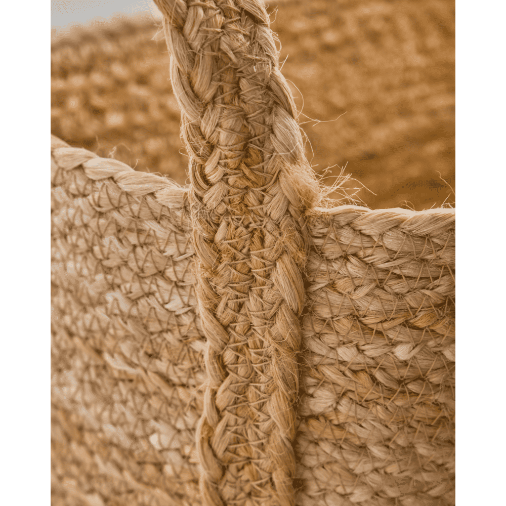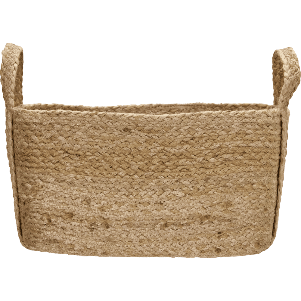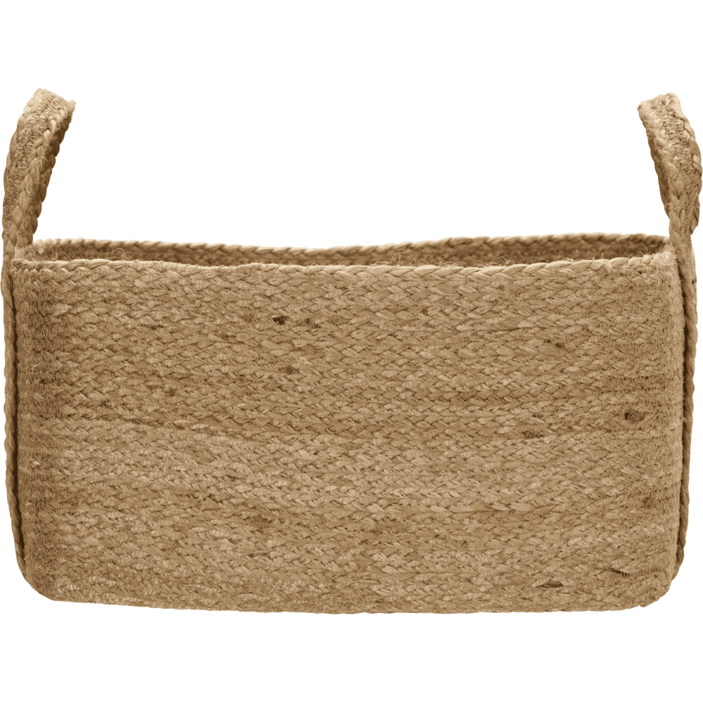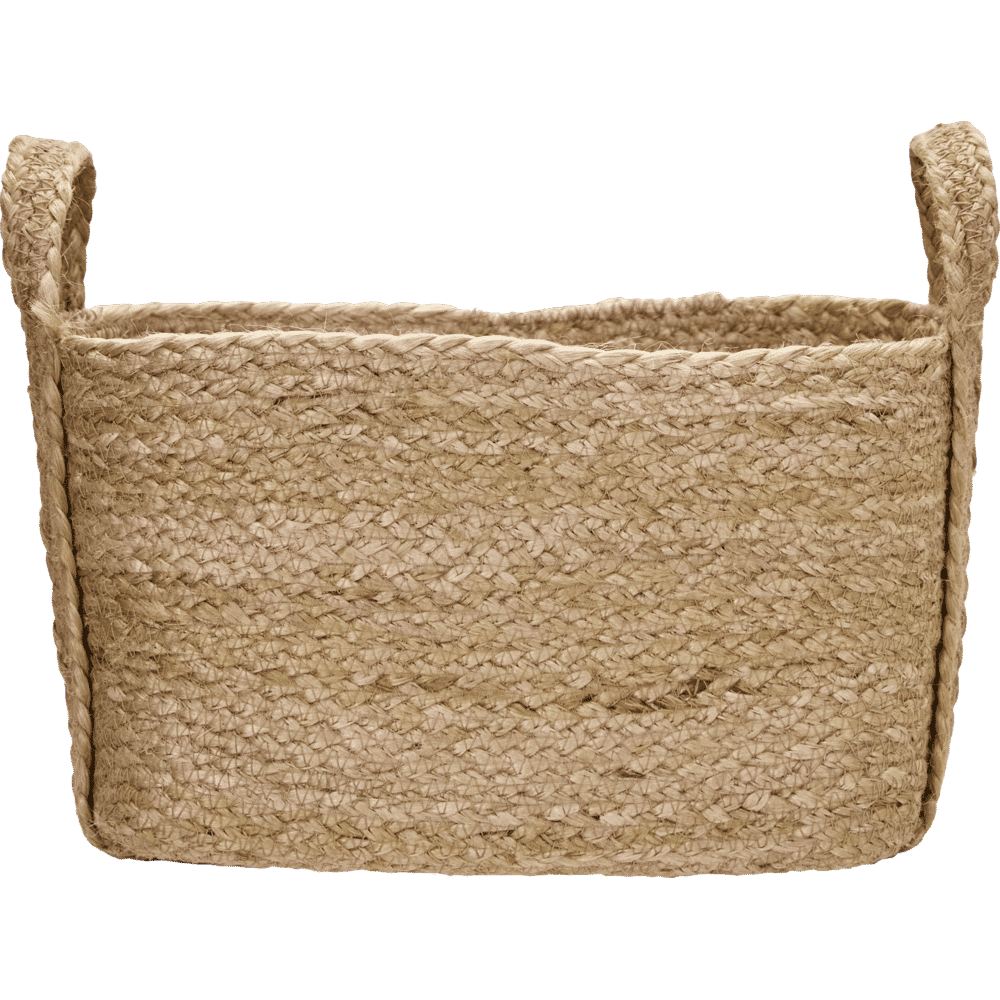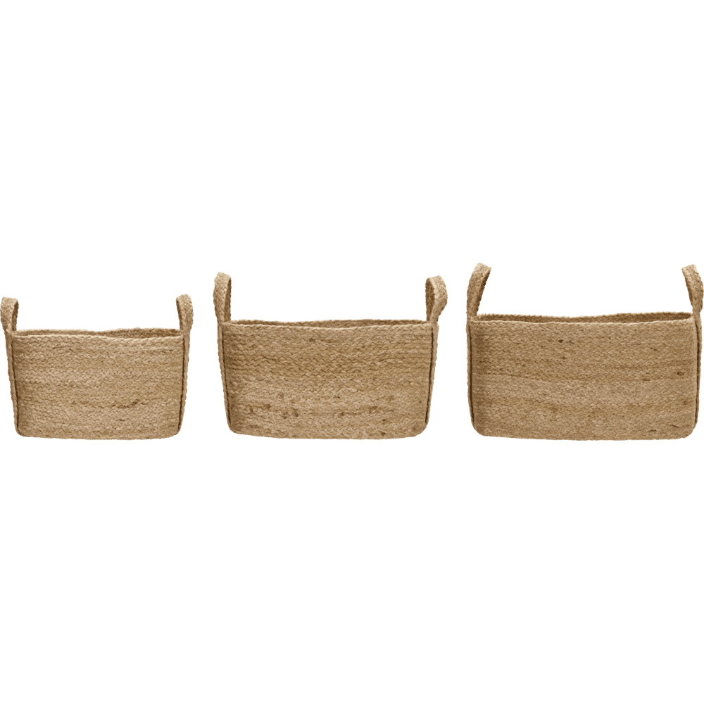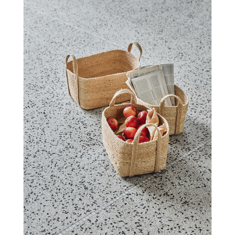 Refresh your home’s storage with these handmade jute baskets, finished in a warm, natural tone. The square silhouette and sturdy, integrated handles create a modern look while making it easy to tidy up anything from towels to children’s toys. Place them in your living room, hallway, or bedroom - wherever you need both relaxed organisation and a touch of laid-back style.- Set of three baskets.- Handwoven with durable jute.- Practical integrated handles.- Decorative and functional touch.Bring understated elegance and natural texture to tidying up the home. Material:Primary: Jute (100%) Inhoud: Foodsafe: Martindale: Montage vereist: Nee Onderhoud / reiniging: Clean with a dry cloth