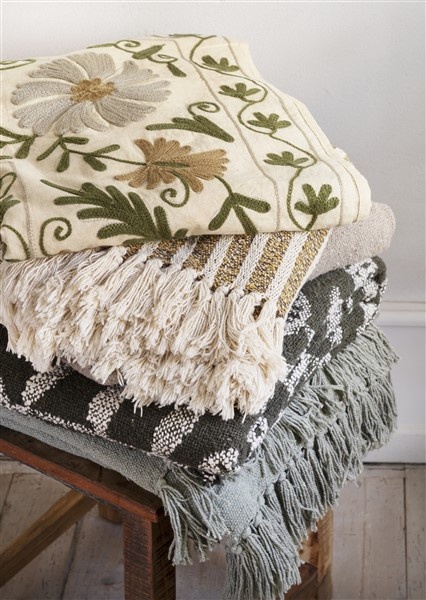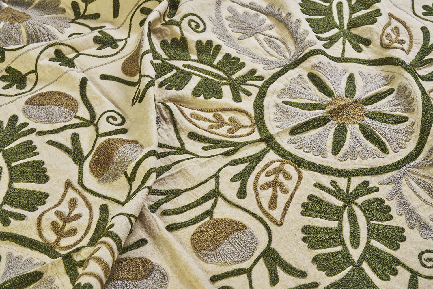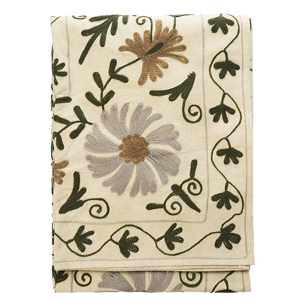 Madam Stoltz Suzani embroidered cotton throw Ecru, green, grey, tapenade
