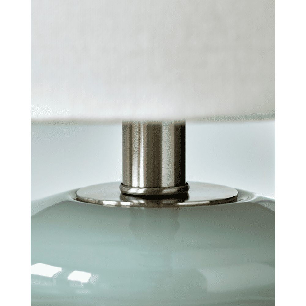 Add a sculptural accent to your home with this table lamp, featuring a handmade light blue glass base and a classic off-white cotton shade. Soft lighting creates a cosy atmosphere and brings personality to your décor.- Handmade glass base.- Cotton lampshade.- Soft, inviting light.- Modern colour palette.Style on your bedside table, desk or living room shelf for an instant mood boost. Material:Bottom: Glass (100%) Small parts: Steel (10%),Iron (70%),Nylon (20%) Lamp shade: Cotton (90%),Styrene (10%) Cable: Polyvinyl chloride (50%),Polyester (50%) Inhoud: Foodsafe: Martindale: Montage vereist: Nee Onderhoud / reiniging: Clean with a dry cloth