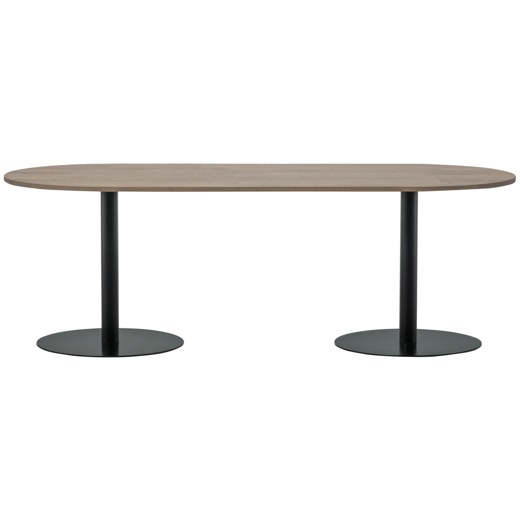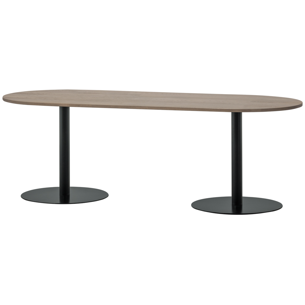 -Ronde poot met eikenhouten tafelblad (FSC mix gecertificeerd) -Creeer jouw ideale eethoek -Ovaal tafelblad voorzien van unieke kantafwerking -H 75 cm X B 219 cm x D 89 cm Creeer jouw ideale eethoek met de veelzijdige Tablo serie van het Nederlandse interieurmerk WOOOD. Met talloze combinatiemogelijkheden en verschillende afmetingen stel je moeiteloos de eethoek samen die perfect aansluit bij jouw wensen. Kies bijvoorbeeld voor deze stijlvolle ovale eettafel met een elegante, strakke uitstraling. Het tafelblad heeft een subtiele, ronde kantafwerking, wat zorgt voor een verfijnde en elegante uitstraling. Het tafelblad is behandeld met een water gedragen, grijze beits, waardoor het hout een prachtige kleur krijgt. Samen met de ronde metalen poot, vormt het de perfecte combinatie! Kenmerken Het tafelblad is gemaakt van stroken verlijmd eikenhout met een vingerlasverbinding wat een speels motief creeert. Eikenhout wordt gekenmerkt door de duidelijk zichtbare nerftekening. De natuurlijke imperfecties van het eikenhout maken elke tafel uniek. De tafelbladen zijn licht geschuurd waardoor de nerftekeningen worden geaccentueerd en de beits- en lak kleuren nog mooier tot uiting komen. Het eikenhout in onze collecties is FSC mix gecertificeerd. De ronde poot is gemaakt van metaal, afgewerkt met een zwarte poedercoating. Afmetingen -Hoogte: 75 cm -Breedte: 219 cm -Diepte: 89 cm - Totaal gewicht: 83 kg - Maximaal draaggewicht: 70 kg Onderhoud Behandeld eikenhout is zeer eenvoudig in het onderhoud. Houd het meubel regelmatig stofvrij met een schone, droge doek. Verwijder vochtige vlekken direct met een licht vochtige doek en neutraal schoonmaakmiddel, laat het hout aan de lucht drogen. Hanteer altijd de basisbescherming voor hout, zoals het gebruik van een onderzetters onder een drinkglas of een hete pan. Raadpleeg bij beschadigingen een gespecialiseerde verfwinkel voor een eventuele herbehandeling van het meubel. Al onze metalen uit de collectie zijn grondig behandeld en vragen dus niet om een herbehandeling. Mocht het metaal beschadigd zijn, raadpleeg dan een gespecialiseerde verfzaak. Behandeld metaal is eenvoudig schoon te houden met een lichtvochtige doek en een mild schoonmaakmiddel, het nadrogen van het oppervlak zorgt voor een streeploos resultaat. Levering Het tafelblad en de tafelpoot worden in twee aparte pakketten geleverd. De tafelpoot is te monteren aan de hand van de bijgeleverde montage-instructie.