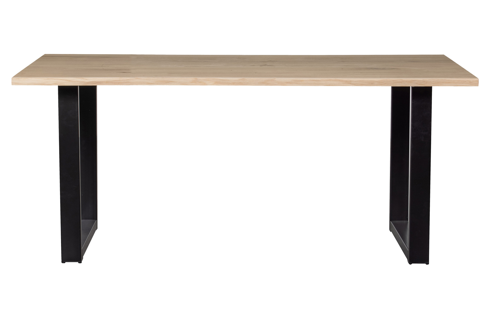 Naturally shaped tree trunk table Solid untreated oak With metal U-leg H 75 cm x W 180 x D 90 cm The oak (fsc) tree trunk table Tablo by WOOOD has a tough, robust appearance. The edges on the long side of the tree trunk table top have retained their original contours. This makes each leaf unique and a real eye-catcher. Please note: This solid oak tabletop is 180 cm long, 90 cm wide and 3 cm thick. Unevenness, cracks and knots are inherent to this natural product. The Tablo U-foot (hxwxd) 72x79x10 cm, is made of 40x80x1 mm steel tube, KD structure and is powder coated matt black. This table has a total weight of 41.8 KG and a load capacity of 150 KG. The table is delivered in three packages and is easy to assemble with the help of the simple assembly instructions.