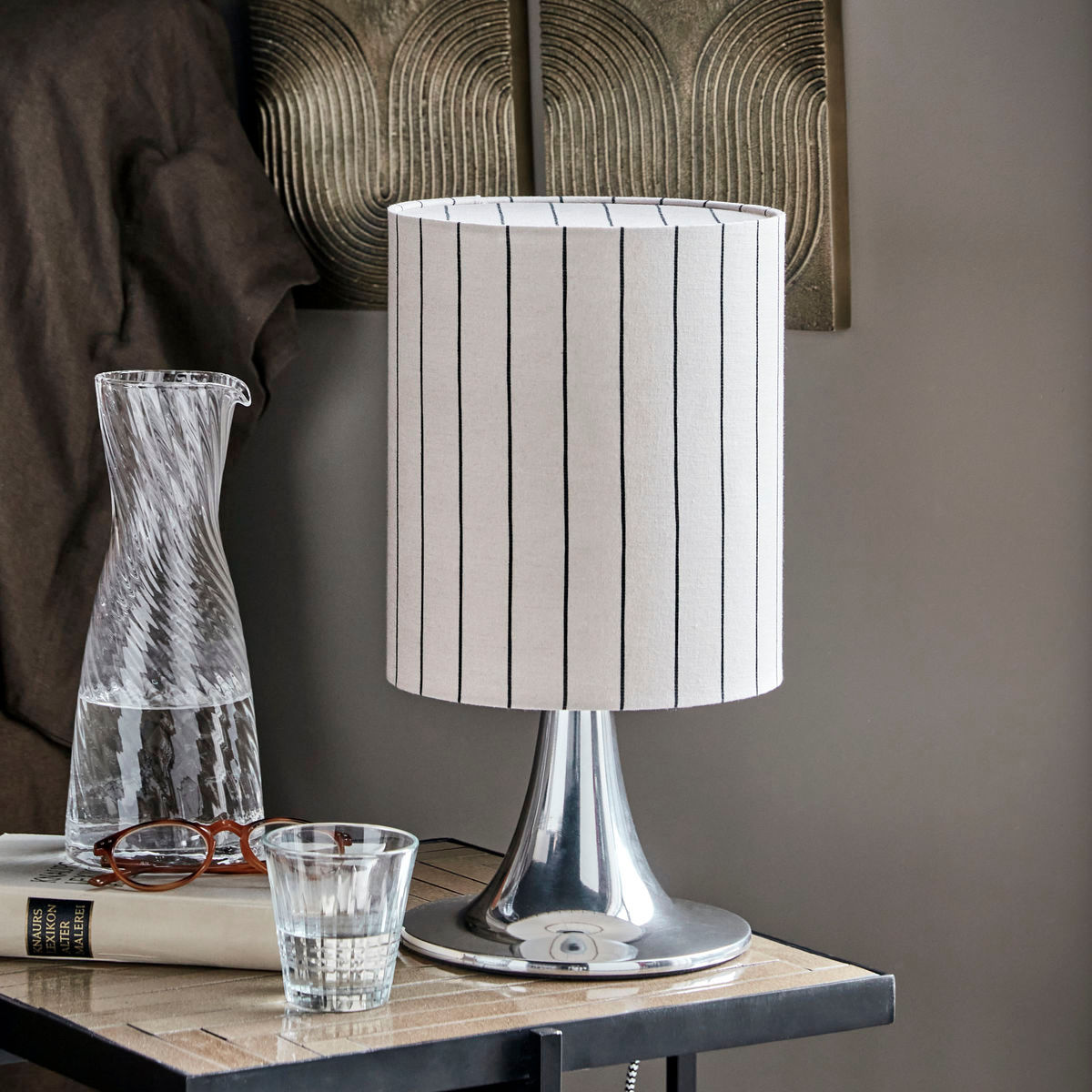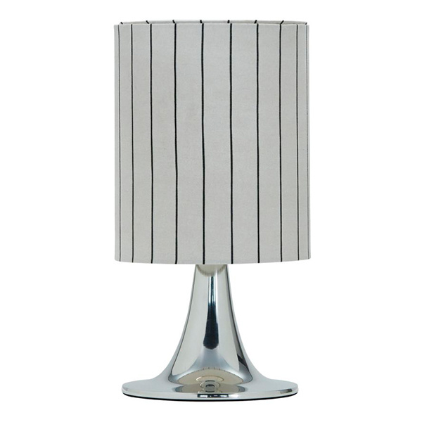 Geef je huis een elegante decoratieve touch en functionele verlichting met deze stijlvolle tafellamp. De lamp heeft een slanke aluminium voet met zilverkleurige afwerking en een tulpenvorm, gecombineerd met een linnenkleurige lampenkap versierd met verticale zwarte strepen. Dit must-have ontwerp brengt persoonlijkheid en een moderne uitstraling in je interieur.