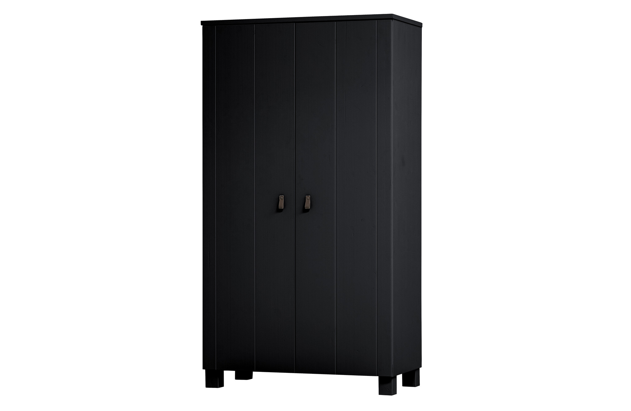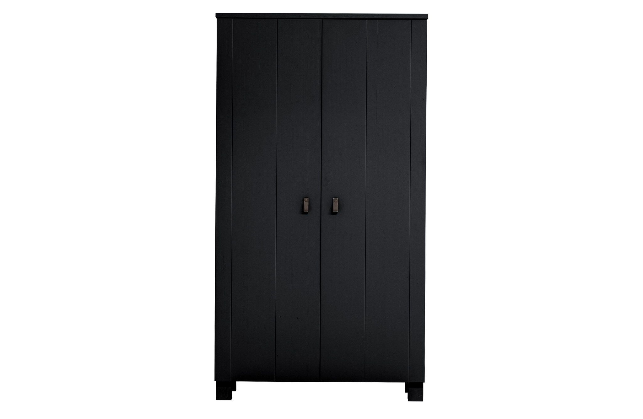 Wardrobe Ties is a Dutch manufacturer of the brand WOOOD. This solid FSC certified pine hanging / laying cabinet has a brushed finish and the doors have 2 vertical V-grooves. The interior of the wardrobe is made of melamine and consists of one wide shelf at the top with a divided rod on the left and three divided shelves on the right. The door is equipped with leather handles in the colour brown. The Ties wardrobe is available in white and deep black (RAL9005). The paint used is water-based. Brushed wood. This piece of furniture is made of brushed wood. The veins and knots are accentuated by brushing, which gives the wood a worn appearance. This treatment can make unevenness, small cracks and knots extra visible. These are characteristics of the aged wood. This makes each copy unique!