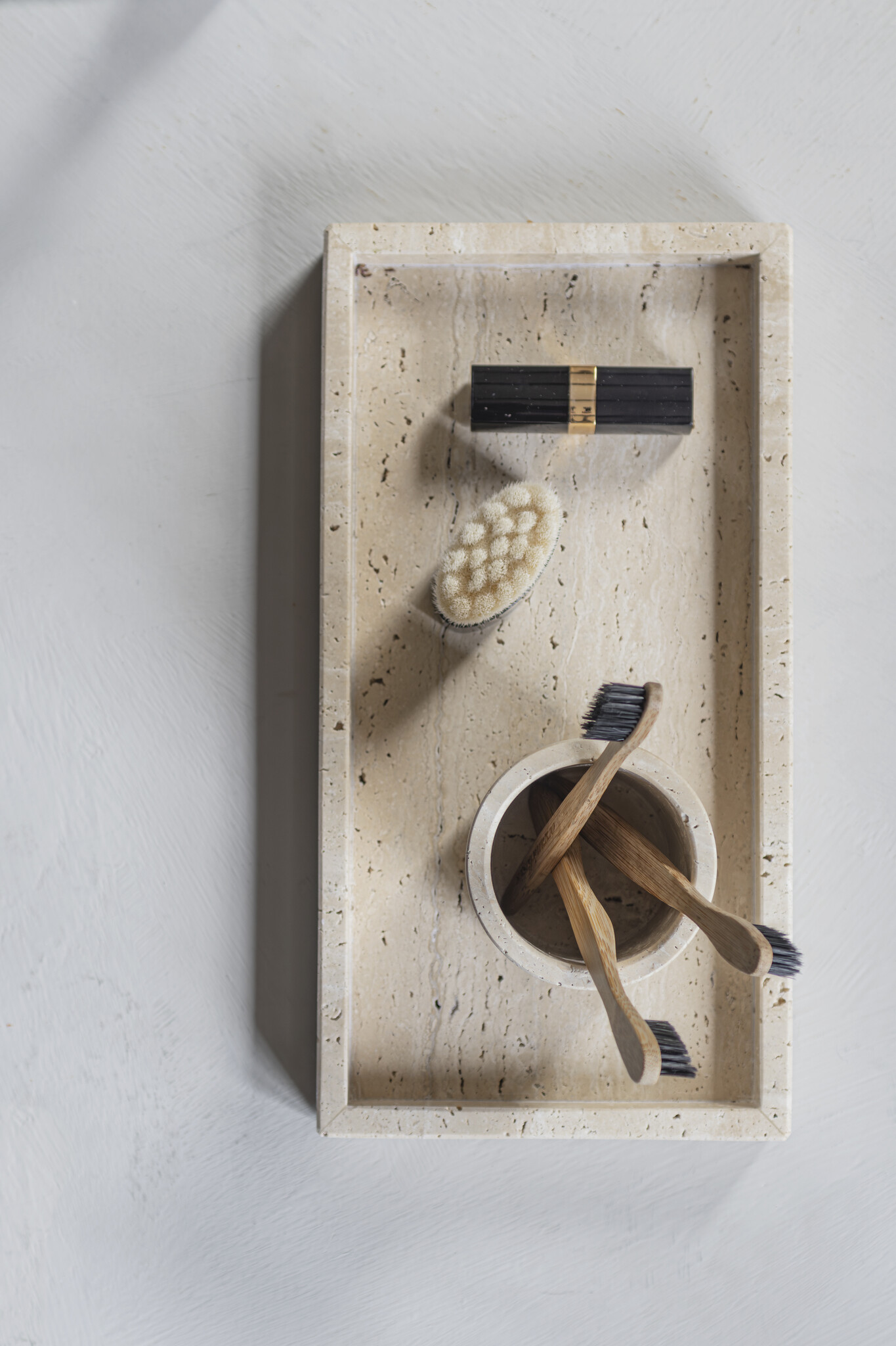 The TRAVERTIN tray is a beautiful and functional piece crafted from the iconic travertine stone, celebrated for its distinctive indentations, natural texture, and earthy tones. Perfect for organizing toiletries in the bathroom, gathering oils and spices in the kitchen, or creating an elegant base for decorations in the living room. Sturdy and versatile, it is both a decorative and practical addition to any room. - Washing/Care Instructions: Wash by hand or use a damp cloth. We recommend general diswashing soap. Does not tolerate acidic cleaning agents. The product is not suitable for the dishwasher. - Washing/Care Instructions: Wash by hand or use a damp cloth. We recommend general diswashing soap. Does not tolerate acidic cleaning agents. The product is not suitable for the dishwasher. - Material Composition: Travertine