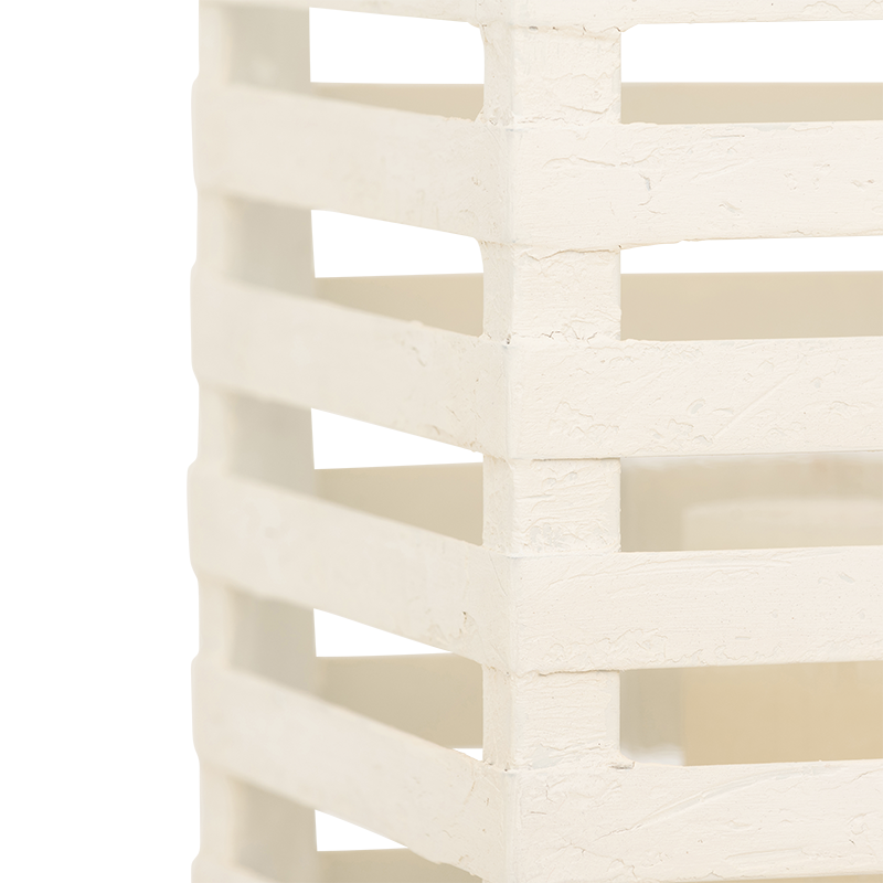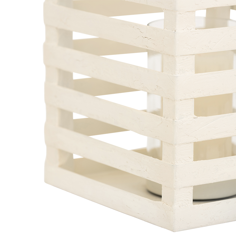 When the heat of the day slowly fades and sunset brings the promise of an endless summer night, the lights of Urban Nature Culture outdoor hurricane Vela take over. Handmade from metal with a matt, off-white and irregular finish, the geometric frame and glass lantern adds warmth and vibrance to its surroundings. The work of local artisans from India, hurricane Vela is one-of-a-kind. Material: Metal Characteristics of the product: - For outdoor use also - Finish cannot chip off - Cannot be a big gap and will be improved when it will be welded by proper dye"