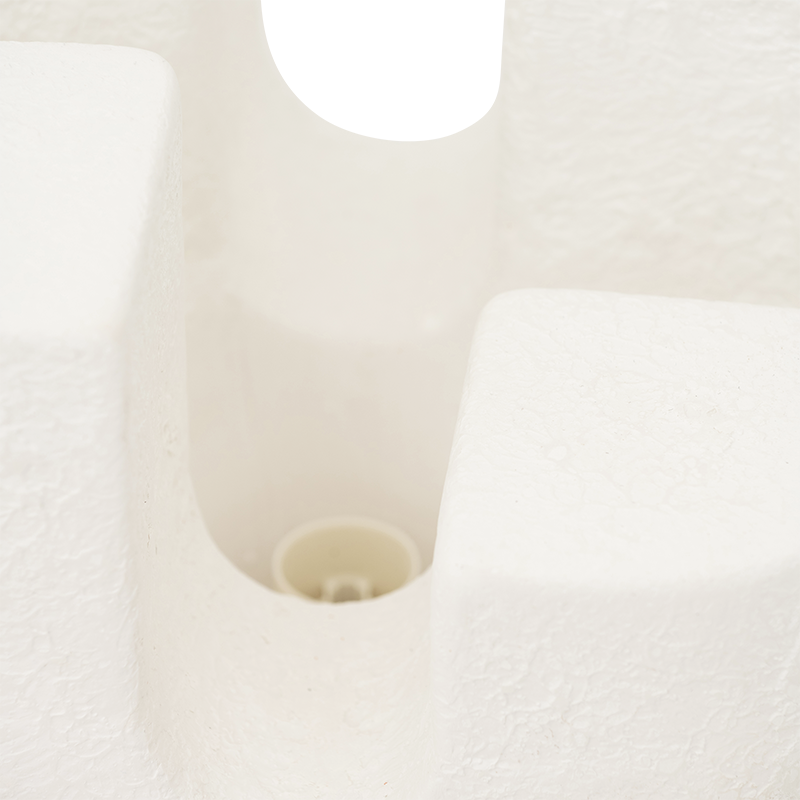 Table lamp Cuarto builds a bridge between functionality and art. Inspired by béton brut – the French term for raw concrete, which still carries all patterns and seams of the formwork. Cuarto is handmade in Portugal from ceramic, with a grainy, irregular, white finish. An abstract piece of art and a beautiful light – in one. A great companion for quiet nights in, resting your head, or hours spent planning your next adventure – it’s all about that balance in life after all. Use with an E14 bulb." Material: Ceramic Characteristics of the product: - Due to surface finish every piece is unique in outcome. - Made in Europe - To use with an E14