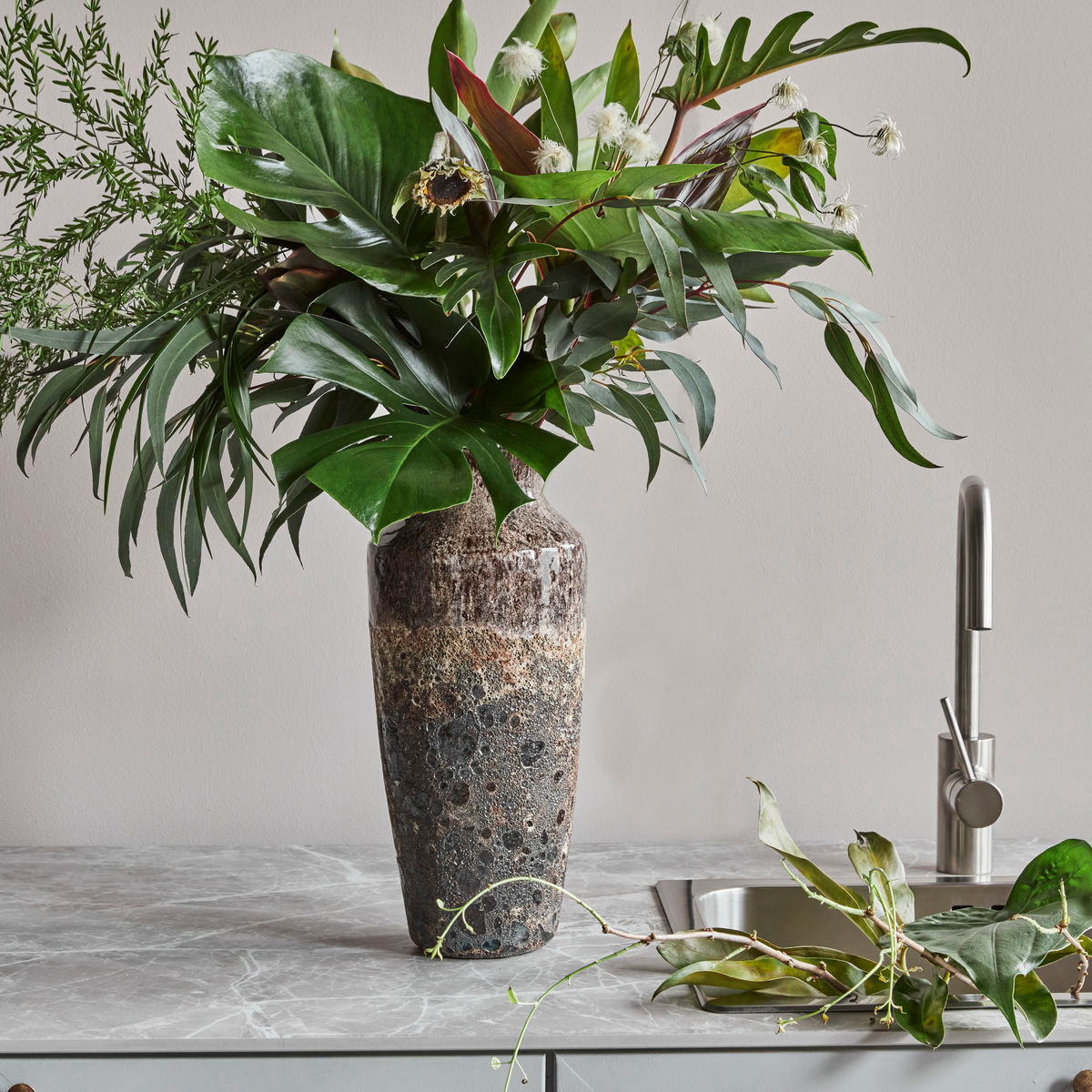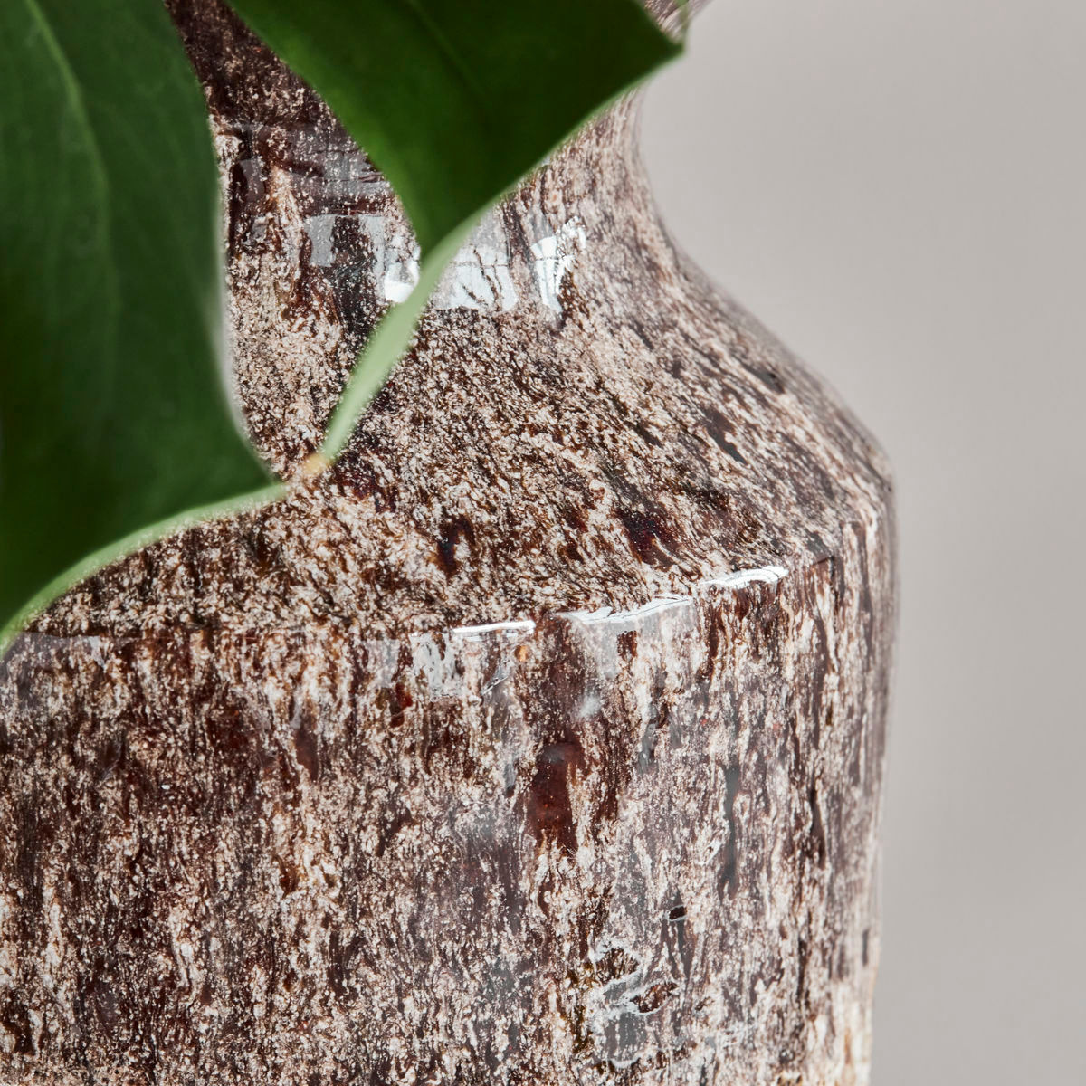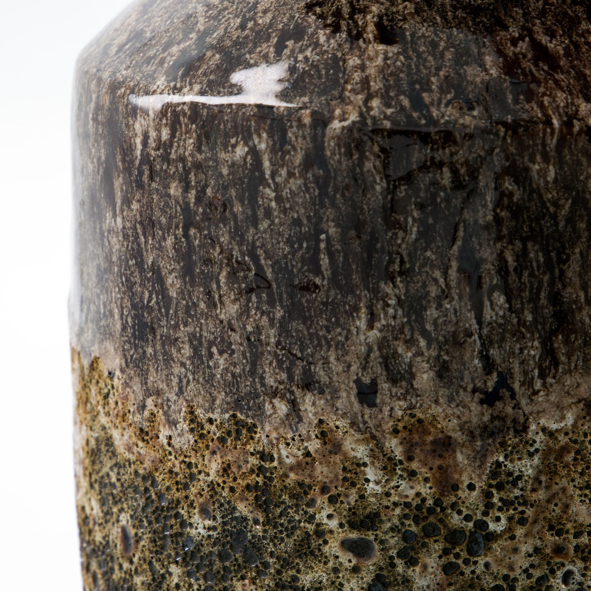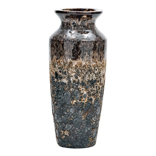 Deze handgemaakte vaas van aardewerk in antiekbruin heeft een unieke glazuur die prachtig varieert. Perfect als kunstobject of voor het tonen van afgesneden takken, zorgt de individuele afwerking ervoor dat geen enkele vaas hetzelfde is.