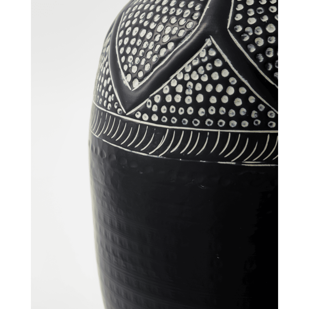 This handmade vase is a true work of art, crafted from a unique blend of aluminium and iron. The vase's black finish and embossed pattern create a striking visual appeal that adds warmth and personality to any home. Its elegant design is perfect for showcasing large flower bouquets or decorative branches, making it a versatile piece for your living room or hallway. Each vase is unique, with variations in finish, colour, and size, ensuring that you have a one-of-a-kind decor item.- Handmade with embossed pattern- Unique black finish- Versatile for flowers or branches- Adds warmth to interiorsIncorporate this artistic vase into your home decor.